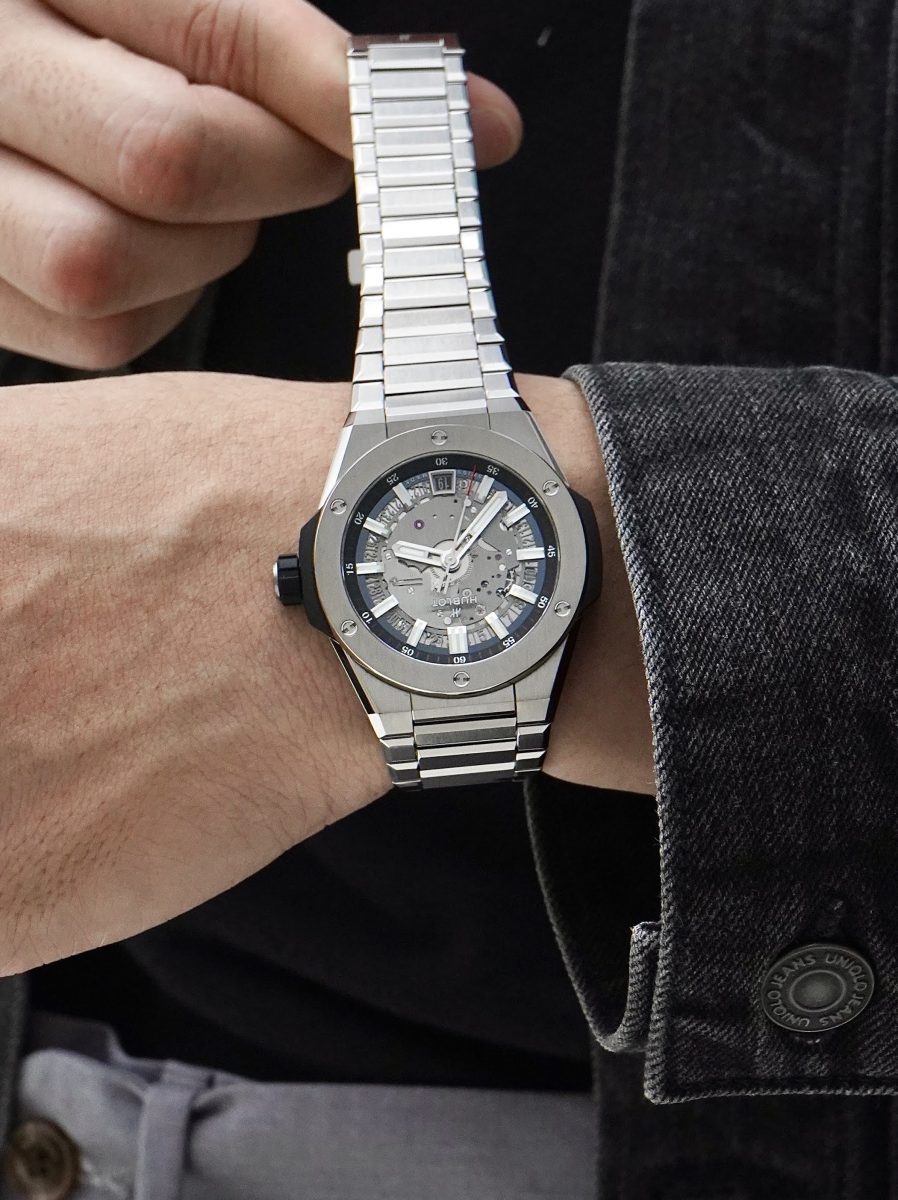 Big Bang Integrated Time Only腕錶的錶鍊由三節鍊條構成,正中央為充滿力量感的主鍊節,兩節在側翼,錶鍊經過細膩抛光與緞面處理,鍊節採用稜角與倒角建構,賦予和錶殼及錶耳相同深邃的質感,與對比的視覺效果。錶圈飾有6顆H型鈦金屬螺絲,強化這款腕錶的超凡整體風格。