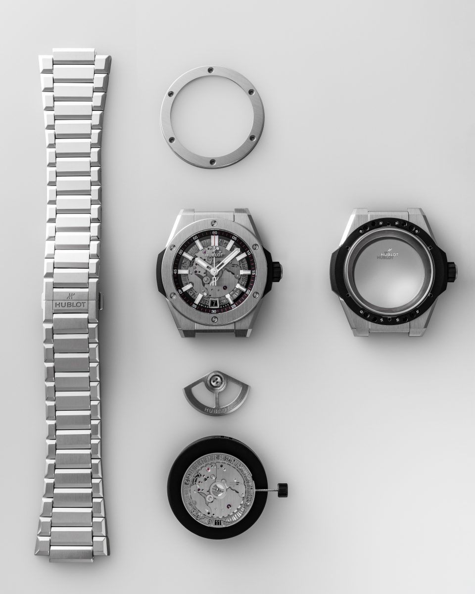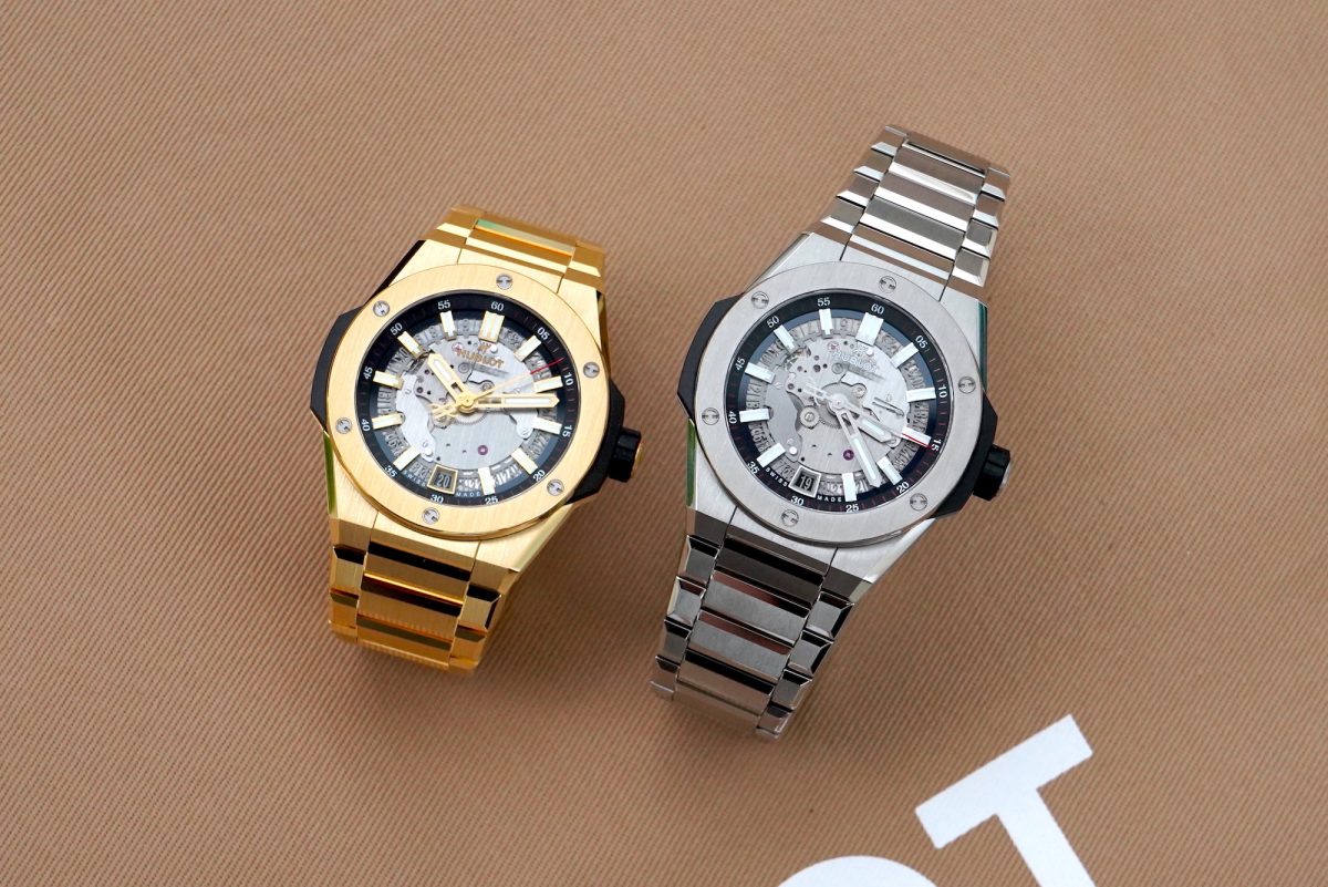 仔細端詳Time Only 的鏤空面盤,透露眾多精密設計細節與巧思,不規則的面盤露出部分機芯零件,展現濃厚工業風的設計。時標則為獨特柱狀立體幾何造型,以精細倒角的拋磨處理,中間附有夜光塗料,隨時維持易閱讀性。搭配品牌特有高識別度的鏤空日期盤,以及面盤外圈數字刻度輔助識別,三款腕錶皆搭載宇舶專屬MHUB1710自動上鍊機芯,具備功能為時分秒指示與日期窗,擁有50小時動力儲存,透明背底蓋,防水性能達100米。整只錶殼厚度為9.35毫米。