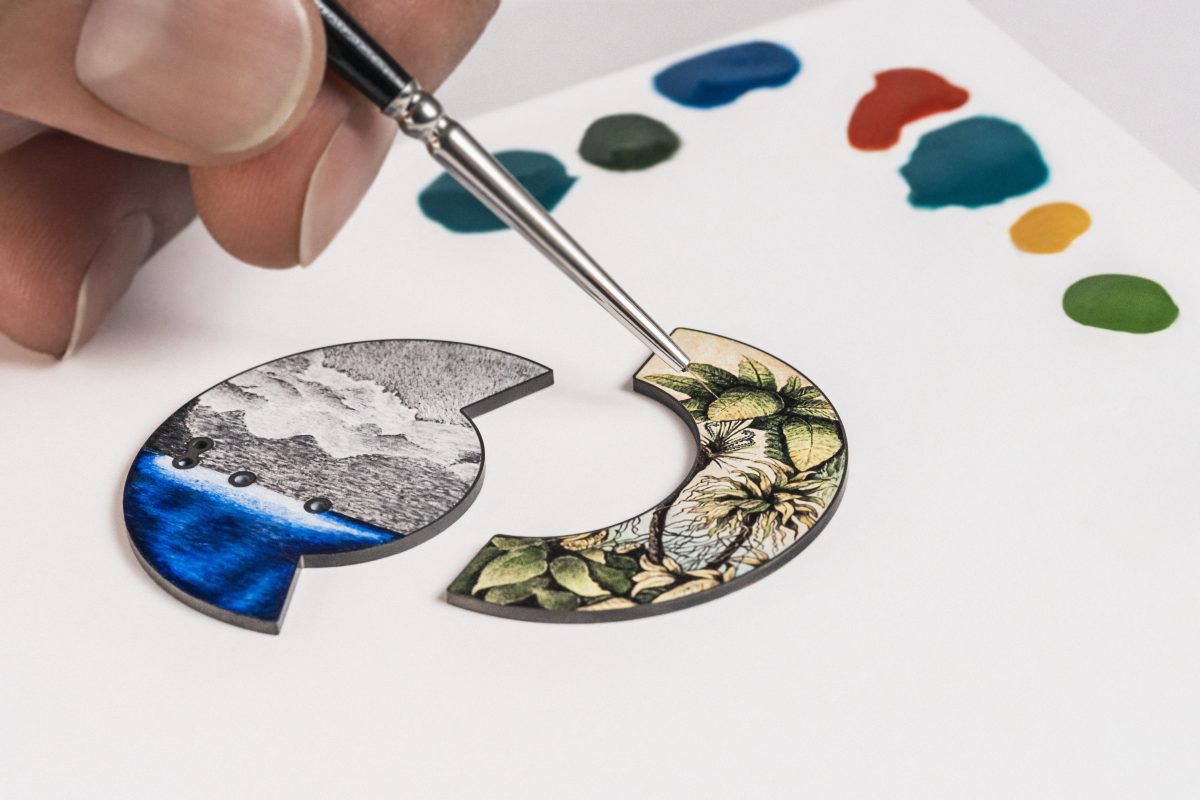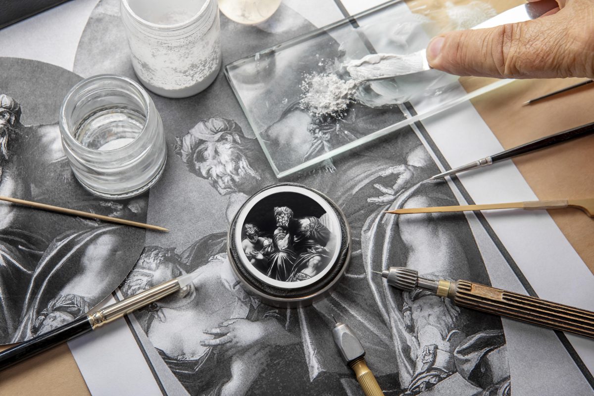 這是一門極為罕見的製錶工藝,這項技術讓藝術品或圖案可以以極細微的方式手繪在烘烤琺瑯的表層上,並透過逐層上色的方式將顏料塗在琺瑯上,然後通過連續的烘烤固定位置。畫作完成後,藝術家最後會使用透明琺瑯通量來保護作品,使其既有光澤又能保持層次感。與其他技術不同,微繪琺瑯非常適合表達細膩筆觸、動態和色彩,因為它能夠模仿古典繪畫的質感和紋理。