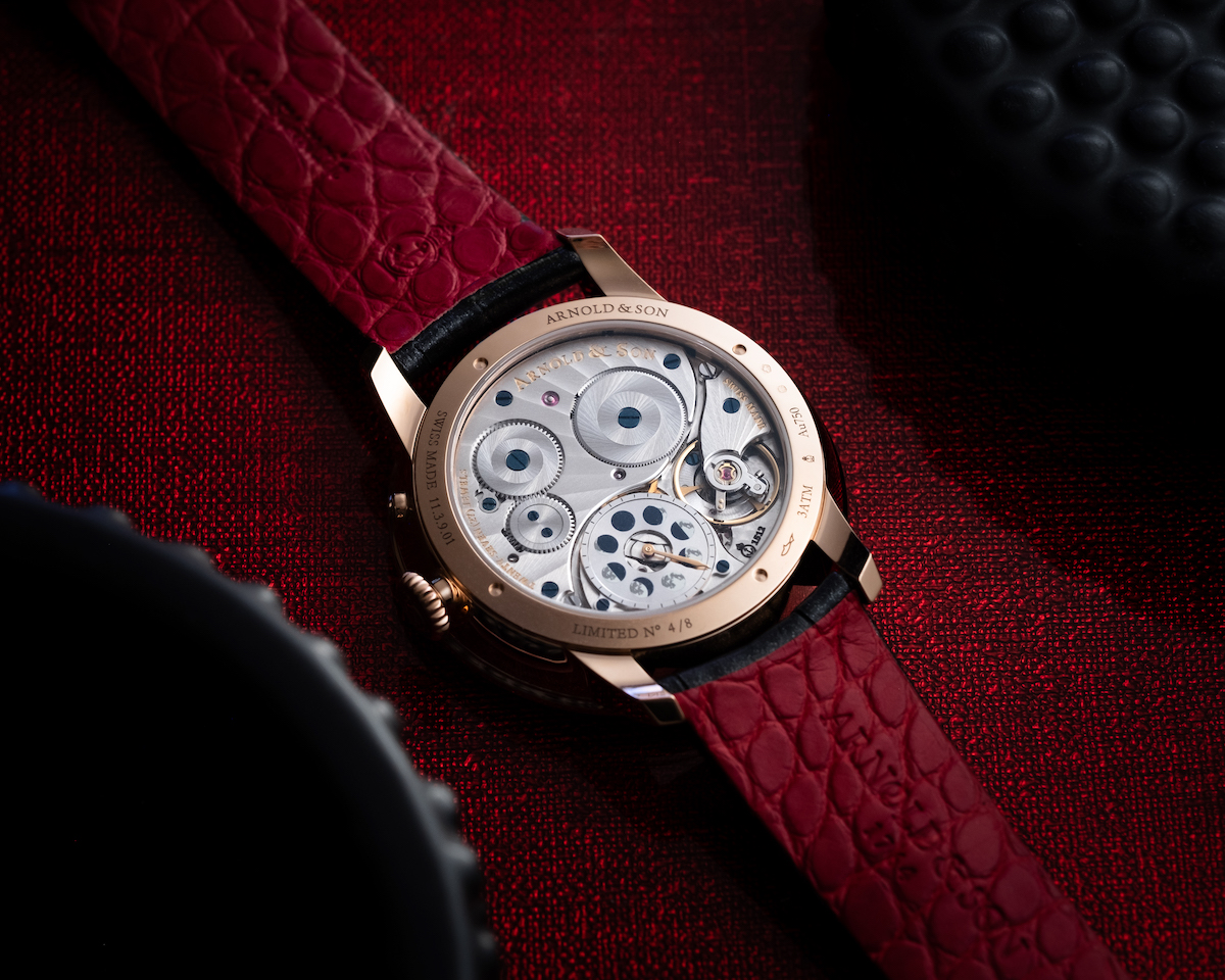 此款機芯透背,可以直接欣賞到機芯的打磨做工,還有另一個月相盤,上有八種寫實月相供調教,Arnold&Son 機芯獨特之處在於每款機芯都是由獨立製錶廠La-joux-perret 研發設計獨立完成,每一款表都是先設計手表外觀再設計機芯的排列,因此每一款腕錶都是獨一無二的藝術作品。其月相精準度高達122年,也相當適合做為傳家之寶。