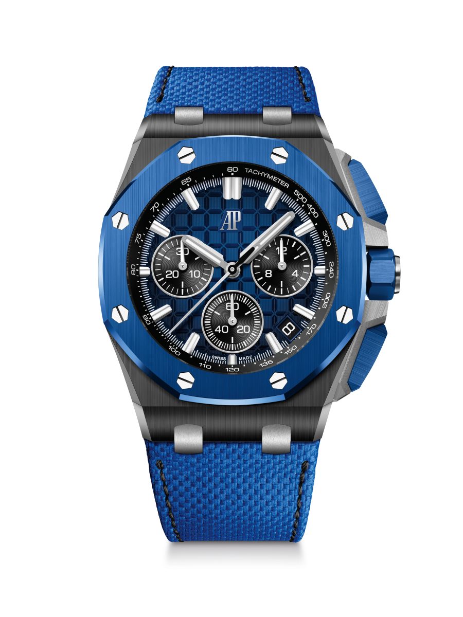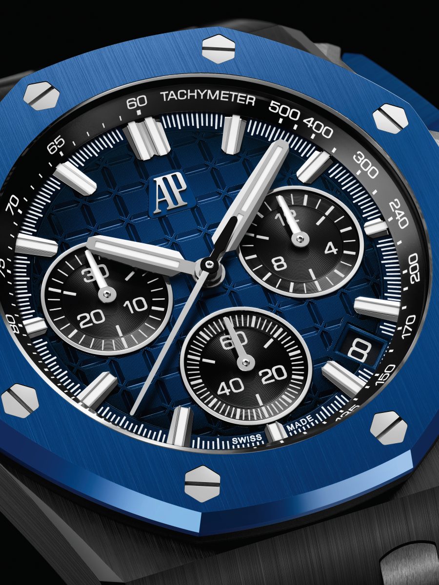 第一款新作採用黑色陶瓷錶殼,搭配藍色陶瓷錶圈、計時按鈕與錶冠,形成深邃的對比。陶瓷零件均經愛彼經典手工精修裝飾,與鈦金屬按鈕護橋及錶帶接口互映增輝。煙燻藍色「Méga Tapisserie」超大型格紋錶面呈現漸變色調,由中央的深藍色向外逐漸加深,至外緣變為黑色。三個黑色計時器分居 9、6 及 3 點鐘位置,白金棒形時標與指針點亮錶面,兩者皆具有螢光塗層,即便在黑暗中依然醒目易讀。