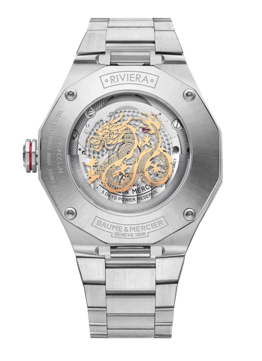 反轉錶盤,別有洞天。 一條氣勢恢宏的五爪金龍,雄踞在十二邊形藍寶石水晶玻璃錶背,與月相盤上的金龍遙相呼應,形成雙龍奉瑞之勢,又獨具低調謙恭的名士風範。 龍紋之下是品牌自製的 Baumatic(BM14-1975 AC1)自動上鍊機芯,為飛龍乘雲的新一年註入源源活力。 夾板鋪陳圓形飾紋,噴砂主機板飾以蝸形飾紋,鏤空擺陀綴以「Côtes de Genève」日內瓦飾紋和蝸形飾紋,龍騰四海的不凡氣魄。這款機芯走時精準,並具有持續運轉 120 小時(5 天)的動力儲存功能,以及高達 10ATM(約 100 米)的防水性能,以卓越性能見證名士人生每一個高光時刻。