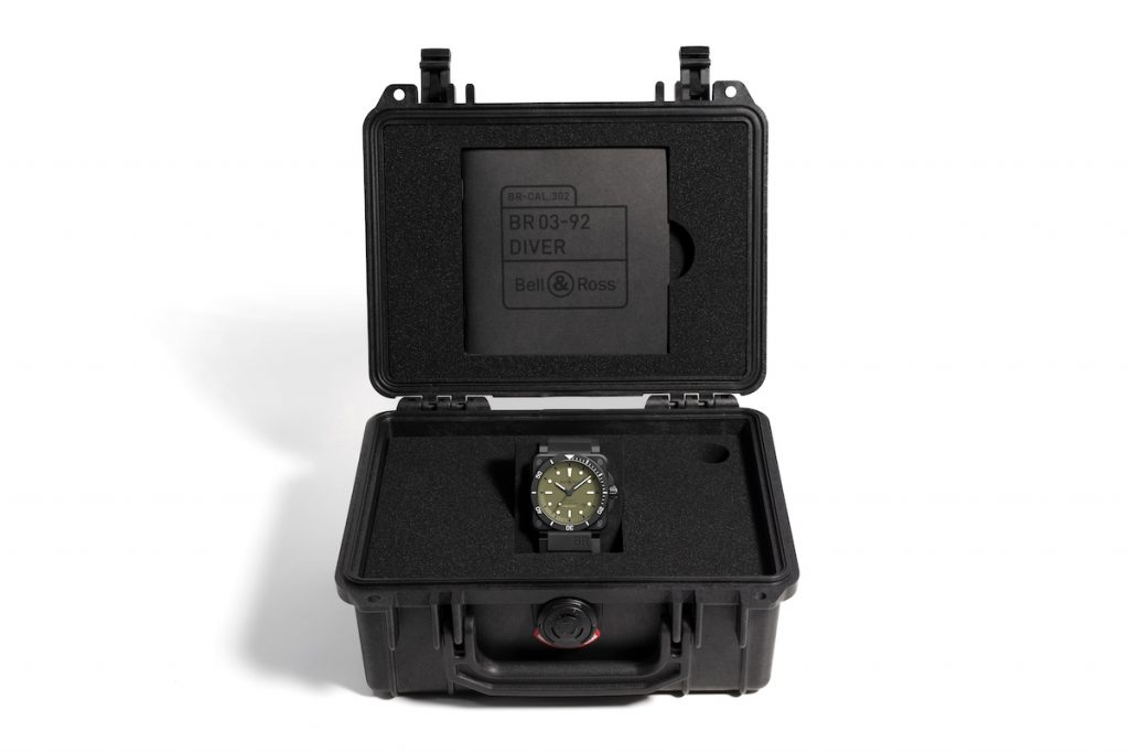 BR03-92 Diver Military潛水錶放置於以PELICAN®防水錶盒,附有兩條錶帶,其一為黑色橡膠帶配PVD塗層不鏽鋼針扣,另一條為強韌的橄欖綠灰色合成物料配Velcro魔術貼扣,方便佩戴於潛水衣及調節鬆緊。BR03-92 Diver Military限量999只,其精密功能及匠心設計符合專業潛水員的要求,相信亦會得到欣賞精彩設計的錶迷歡心。