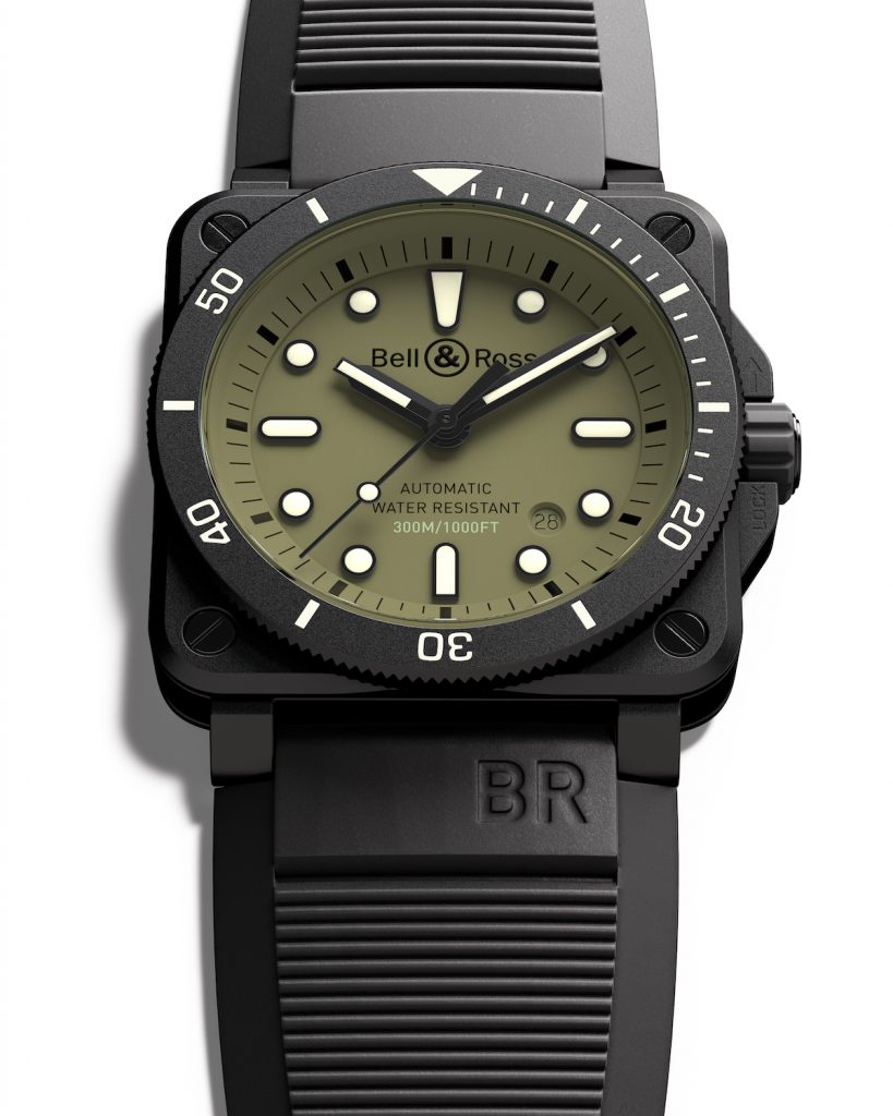 BR03-92 Diver Military的技術與功能既有專業軍錶風範並符合ISO 6425國際認可標準,兼備Bell & Ross為潛水錶訂立的防水,易讀及可靠的三大技術特色。BR03-92 Diver Military防水達300米,陶瓷外殼與不鏽鋼內殼合而為一,足以抵禦水底嚴苛環境。特厚錶背設計,防眩藍寶石玻璃錶鏡厚達2.85毫米(其他BR03-92錶款的錶鏡厚1.50毫米),確保防水性能完美發揮。旋入式錶冠可抵禦水底巨大水壓,護肩設計避免錶冠受撞擊並提升防水性能,錶冠鑲嵌橡膠圈操作不易滑手。