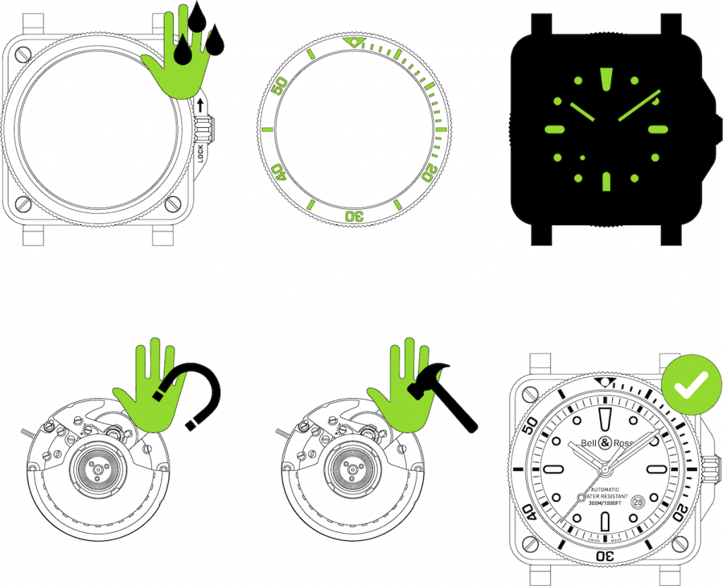 BR03-92 Diver Military的細節設計精巧實用,例如錶盤的夜光時標符合黑暗環境中距離錶盤25厘米亦可清楚閱讀的標準。鏤通金屬時標有Superluminova® C3綠色夜光物料,時針,分針及秒針亦有Superluminova® C3綠色夜光物料,分針亦可用於計算潛泳時間,在水底環境閱讀時間毫無障礙。在日間及光線充足之下,夜光物料呈淡杏仁色,在水底黑暗環境中即泛起光亮的綠色,這種綠色夜光物料功能出眾,顏色濃烈兼技術極為創新,與時標及指針的黑框對比更提升了易讀性。