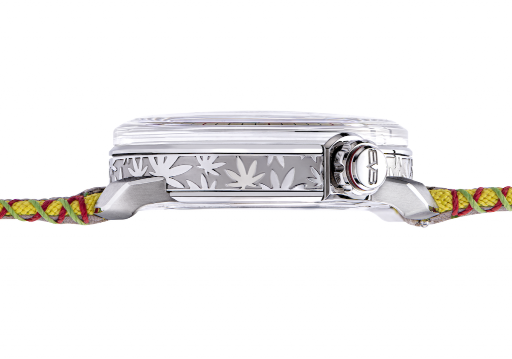 這款腕錶搭載瑞士製造自動機芯,放膽演繹傳統製錶工藝。錶盤上飾有大麻的七片鋸齒狀邊緣葉子。大麻葉填滿吸睛的SuperLuminova夜光塗層,即使在黑夜裡也清晰可見!錶盤內含有真正的大麻葉萃取物。這些葉子採自美國內華達州的一處種植農園,該農園符合最嚴格的環境、永續和自然生產標準。