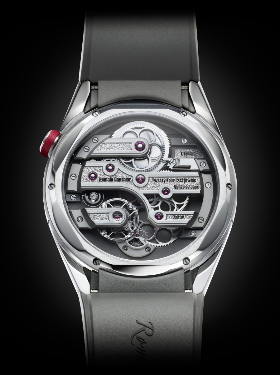 錶盤的外圍是鈦金屬錶圈,其引人注目的幾何輪廓與以前在 Romain Gauthier腕錶上所看到的一切都不一樣。首先將錶圈加工成具有斜面的圓形,然後再切入6個直邊以製造6個切面,這些經過拋光的切面反射光線並帶給錶圈生命力,錶圈的其他部分則進行吸光的緞面處理。相同的切面設計也出現在手錶背面的藍寶石水晶周圍。