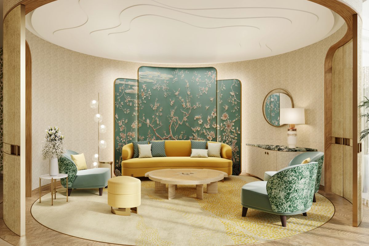 大量運用圓形與弧線布置出溫暖舒適的氛圍。湖水綠、淺鵝黃等輕盈色調與牆面搶眼生動的視覺效果完美調和。