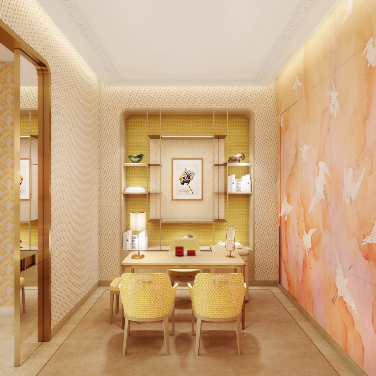 VIP室運用明亮色彩歡迎賓客細細品味卡地亞非凡絕倫的工藝傑作。時而清新時而強烈的視覺元素讓人陶醉於純粹喜悅,感受珠寶之美。