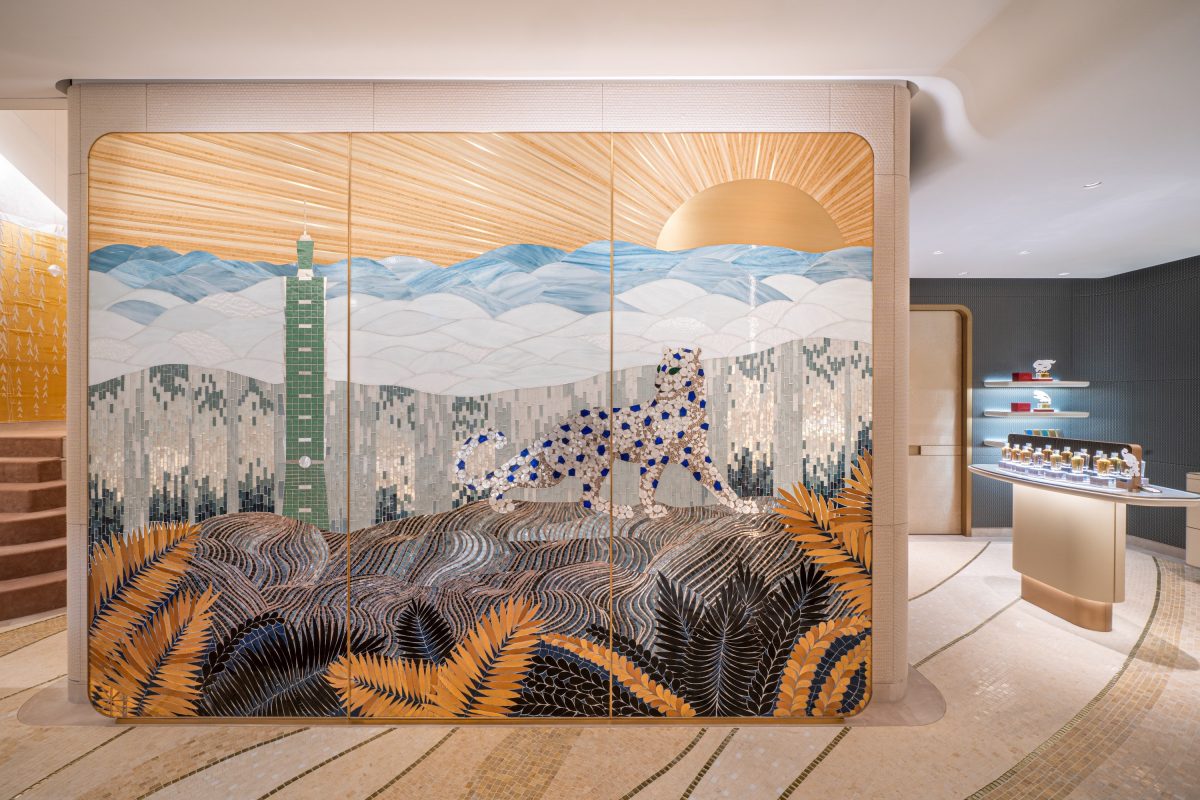 牆面上的珠寶壁畫是馬賽克藝術家 Mathilde Jonquière 為台北旗艦店所訂製的作品,描繪夕陽西下時台北層次起伏的都市天際線,以及環繞四周的蓊鬱山林與茶園梯田,迷彩般的藍綠漸層配色汲取自多彩玉石。