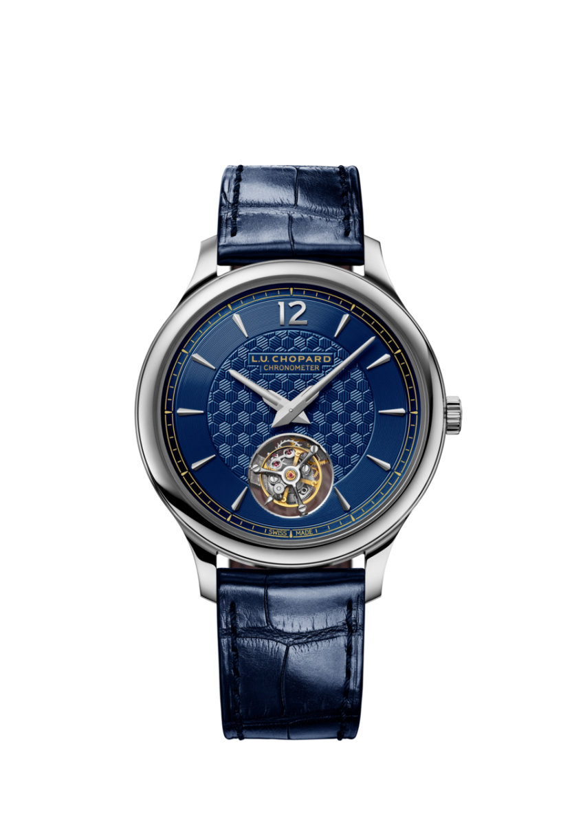 L.U.C XPS Tourbillon Volant 超薄腕錶由 18K 白金製成簡約俐落的外殼,此設計讓目光可聚焦於面盤的細節上,首先細看經電鍍處理的藍色錶盤,一圈一圈裝飾著金質手工扭索飾紋,而面盤中央搭配了「蜂槽圖案」,這種設計最早於 2017 年在 L.U.C 系列首度出現,意味向創始人 Louis-Ulysse Chopard 首個象徵蜂箱的標誌致敬。