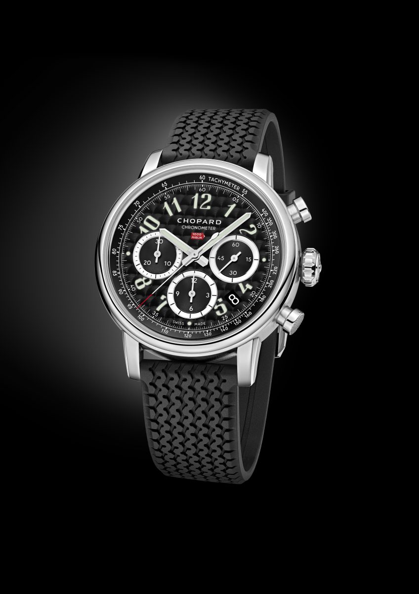 Mille Miglia Classic計時碼錶精鋼款/錶徑:40.5mm/機芯:自動上鍊計時機芯/防水深度:50m/動力儲存:54小時/60年代鄧祿普輪胎紋(背面剎車痕紋理質感)橡膠錶帶/定價:327,000NTD