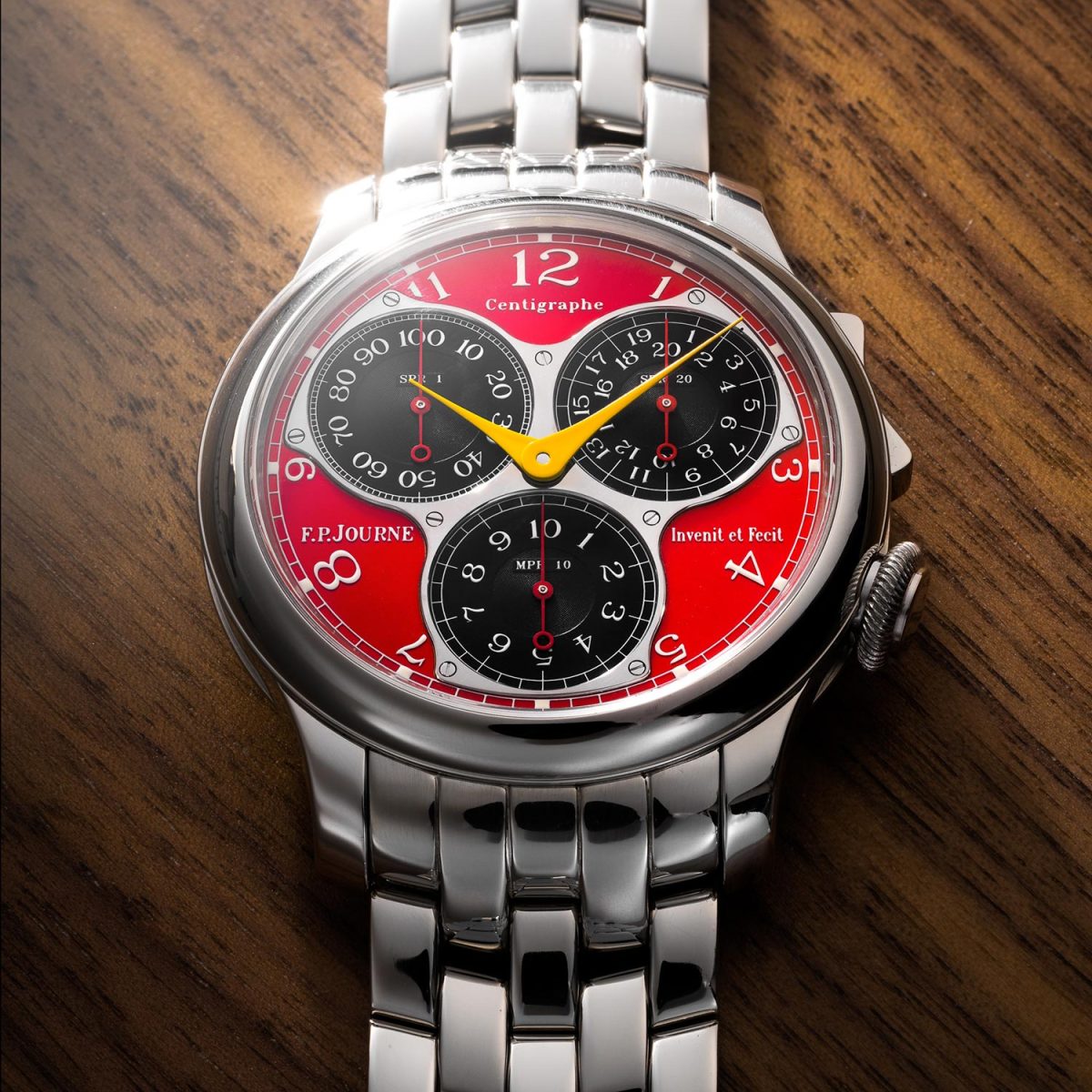 另一枚獨特難求的經典F.P. Journe腕錶,為Centigraphe Souverain鉑金人體工學計時碼錶,配備百分之一秒、20秒和10分鐘計時顯示,並配以紅色鍍鉻錶盤和鉑金錶鏈。這枚經典F.P. Journe Centigraphe Souverain腕錶的法拉利紅色錶盤應客戶要求特別訂製,完美結合高級鐘錶與賽車運動。約2010年製。(估價:瑞士法郎400,000-600,000)
