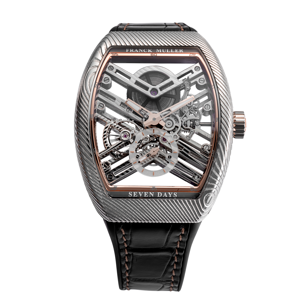 腕錶搭載的 MVT FM 1740-VS2 機芯展現出令人驚艷的鏤空設計,精巧的錶橋結構由大馬士革鋼與玫瑰金完美交織,彰顯出 Franck Muller 對細節的無比重視。玫瑰金的時針、分針與秒針在機芯內部流動,與錶冠蓋及側面嵌件相得益彰,無縫契合的設計令整體視覺效果更為華麗。位於 6 點鐘位置的白色藍寶石秒針盤環,配有玫瑰金刻度,進一步提升了奢華品味。