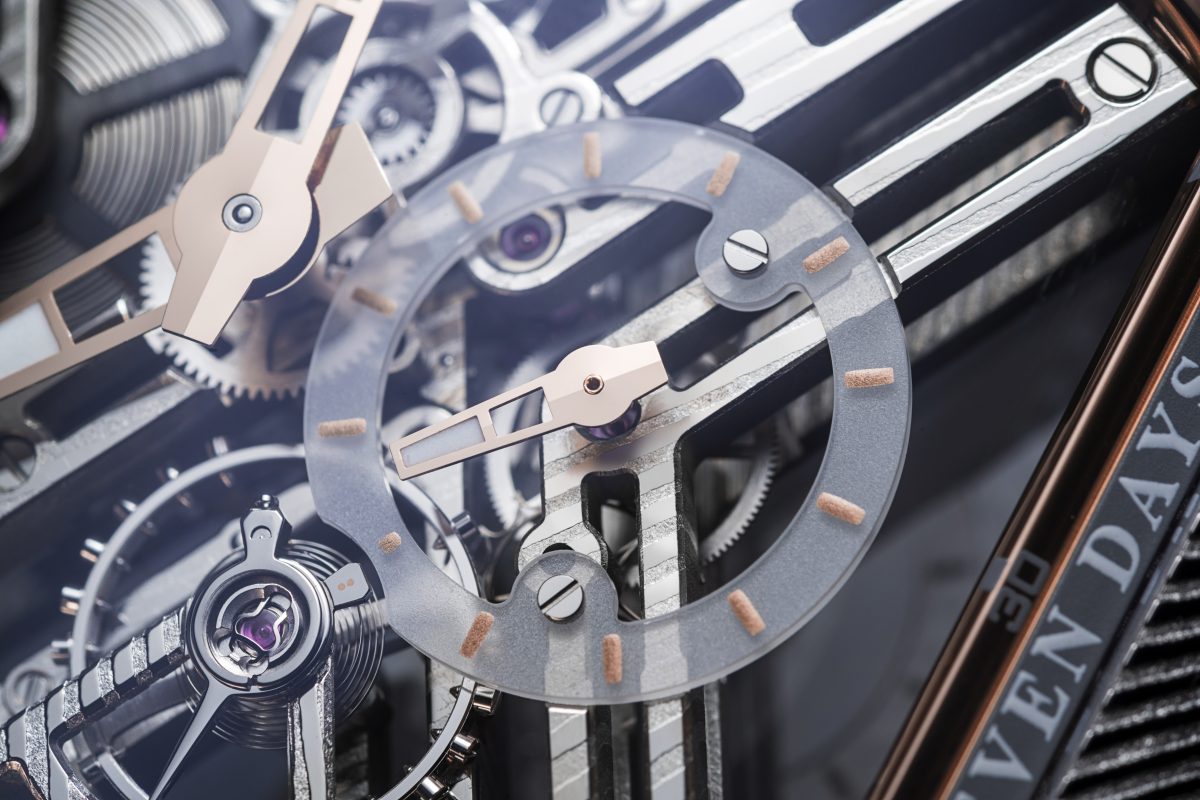 MVT FM 1740-VS2 鏤空機芯以 2.5Hz 頻率運行,並擁有 7 日的動力儲存,每一個細節,從鏡面拋光的調節器元件到精緻倒角處理的主夾板和錶橋,無一不展示著技術的巧思。側面拉絲工藝賦予機芯深度,鑽石拋光的鑿槽和緞面拉絲處理的齒輪,完美展現精緻美感。