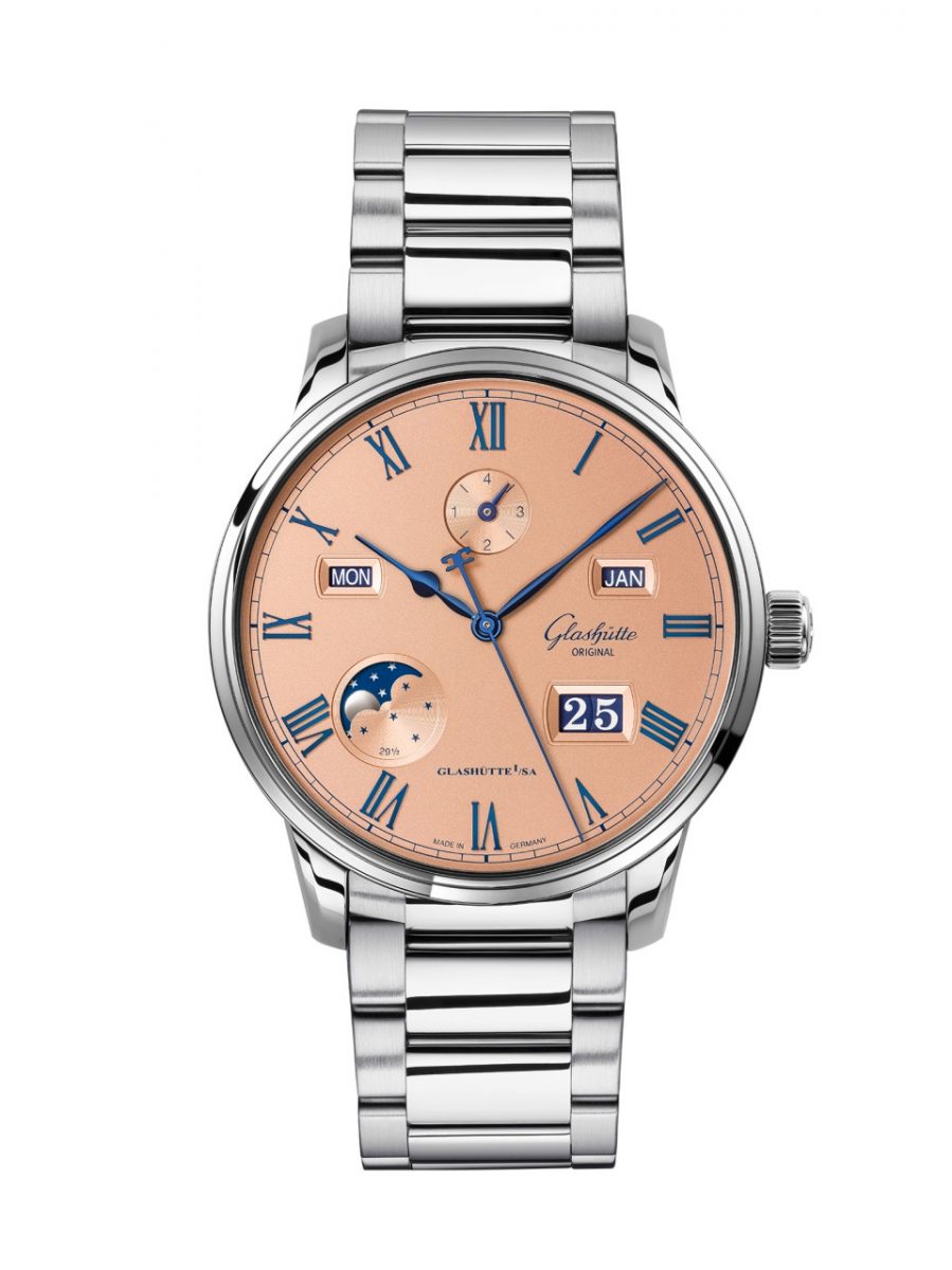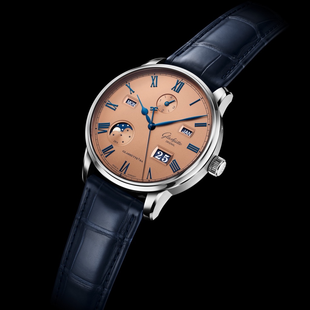 Glashütte Original 格拉蘇蒂原創的最新腕錶突破了商務腕錶經典的黑/白和灰/棕配色,轉而增添一組現代又雅致的顏色組合:玫瑰粉色與深藍色!玫瑰粉色錶盤的製作和裝飾過程極盡繁複考究,需要眾多步驟。柔和的玫瑰粉色調與藍色的小時時標形成華麗對比。時標為手工鑲嵌羅馬數字,別具特色。此外,深藍色還出現於精緻的梯形日曆窗口、月相顯示窗、優雅的梨形指針以及路易斯安那鱷魚皮錶帶,令腕錶整體設計和諧呼應,一氣呵成。