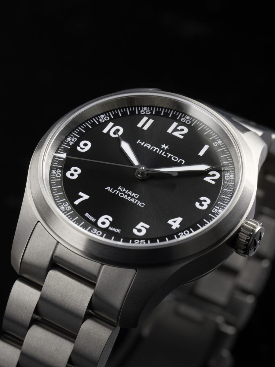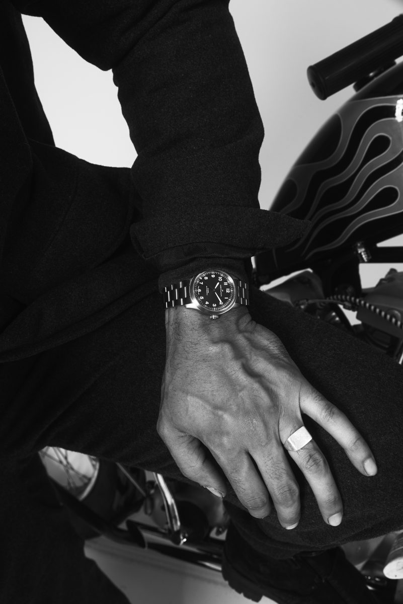 腕錶搭配鈦金屬錶鏈,在 Khaki Field 系列的冒險潛力與持久的耐用性之間取得平衡,為其經典之作。而針對錶盤,鈴木則選擇較少干擾的簡約設計,以忠於陸戰腕錶原本的使用目的。鈴木表示:「我主張使用又輕又耐用的鈦金屬。其略深的銀灰色調為鈦金屬獨有,能完美地與粗獷的戶外風格搭配。」