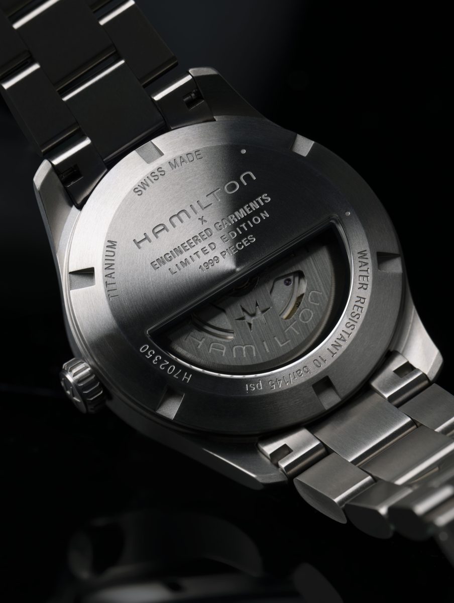 動力來源為 H-10 自動機芯,具備 80 小時動力儲存並鑲嵌 25 顆寶石,內部的 Nivachron™ 平衡彈簧提升了抗磁場、溫度變化和衝擊的能力。如同所有 Engineered Garments 單品一般,此款腕錶為限量供應 1,999 件,以鈴木創立 Engineered Garments 的 1999 年為參考。