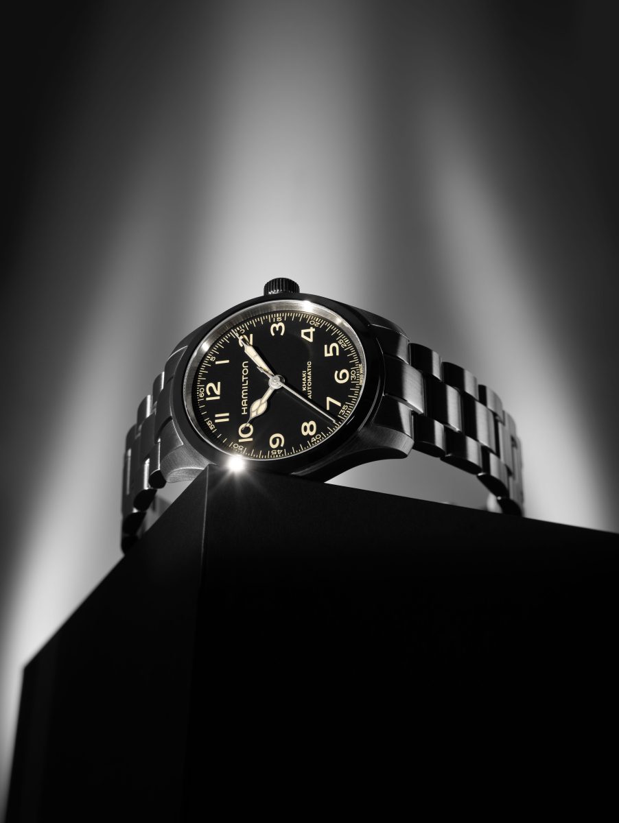 漢米爾頓 Khaki Field Murph 腕錶/錶徑:38 mm/機芯: H-10自動上鍊機芯/動力儲存:80小時/防水深度:100米/建議售價:NTD 30,500 白面皮帶款 NTD 33,500 黑面鍊帶款