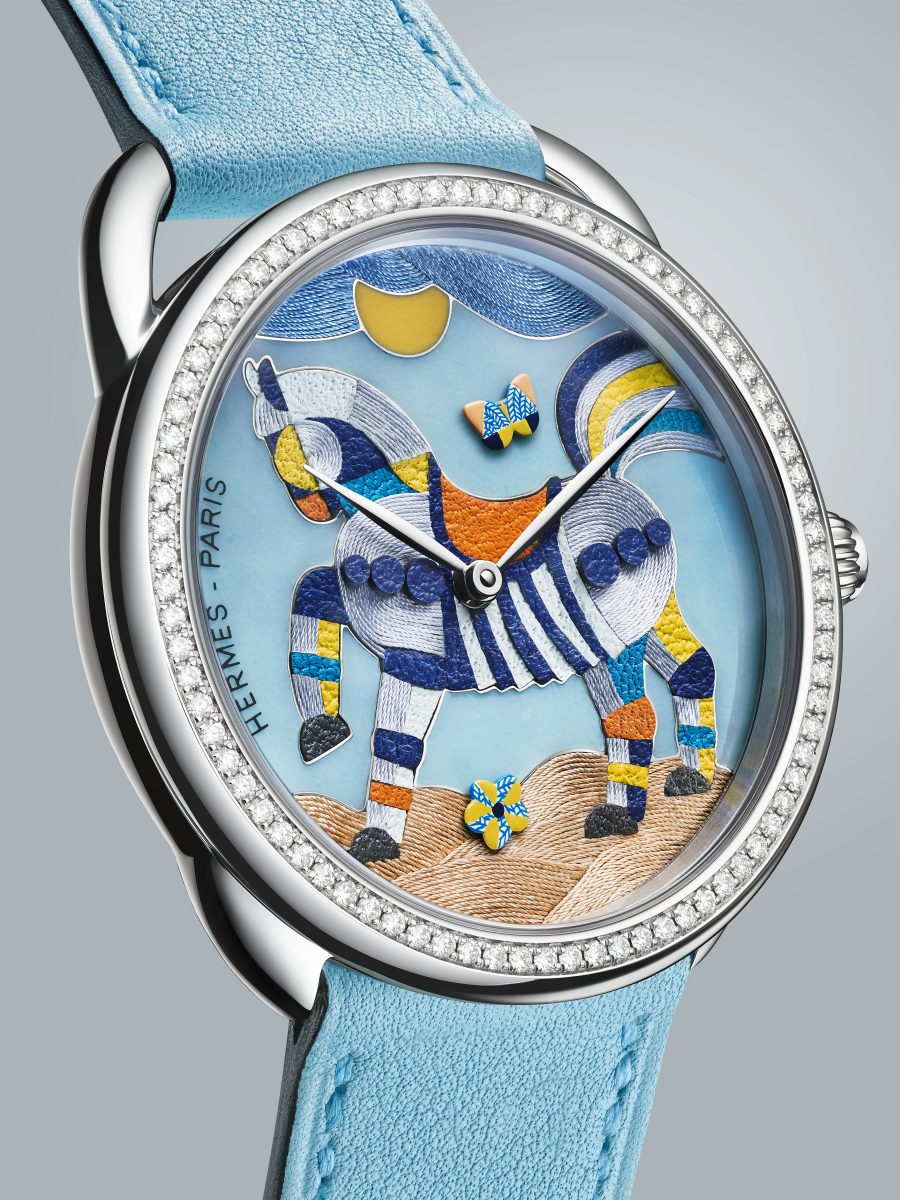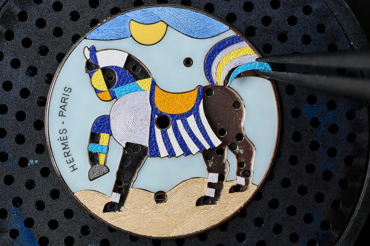 這匹駿馬在光彩耀眼的藍色背景下脫穎而出,馬匹由絲線和被修飾至僅 0.5 毫米厚的各色皮革組成。皮革和絲線分別被鑲嵌在錶盤上,形成細緻繽紛的裝飾,並在微小、可動的手工彩繪金質貼花襯托下,顯得更加生動活潑。