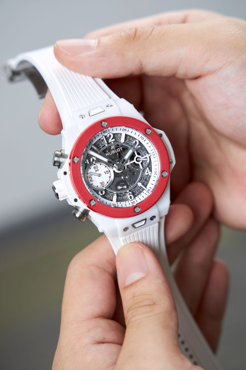 除了搶眼的外觀,Big Bang Unico 左冠陶瓷計時碼錶的內在工藝同樣無可挑剔,搭載自製 UNICO 飛返計時導柱輪自動上鍊機芯,厚度 6.75 毫米,直徑為 30 毫米,具備飛返計時碼錶與日期顯示功能,腕錶左側的鈦金啟動停止與重置按把,及白色立體刻紋橡膠包覆的錶冠,以其堅固耐用的特質,彰顯出實用主義的設計理念。