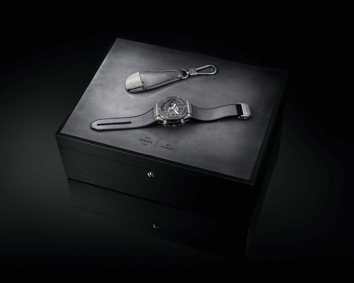蘊含宇舶錶和Berluti在製錶和皮革的卓越工藝,全新Big Bang Unico Berluti冷灰計時碼錶採用特製錶盒,並附贈旅行攜帶盒和Berluti標誌的鞋拔鑰匙鍊。全球限量發行100枚。