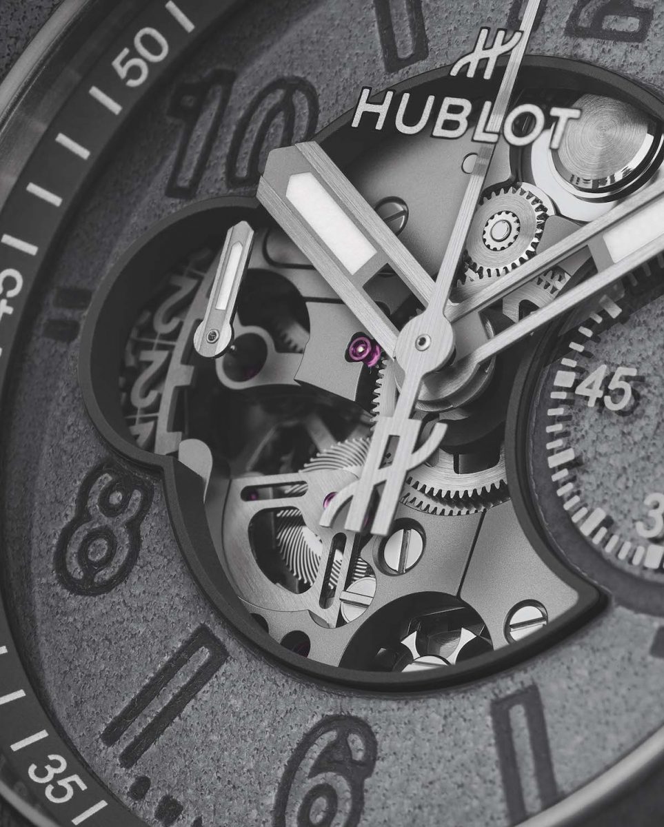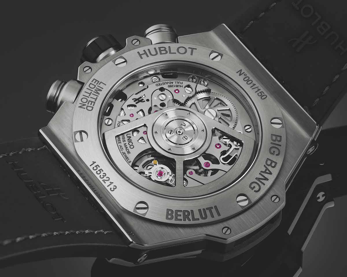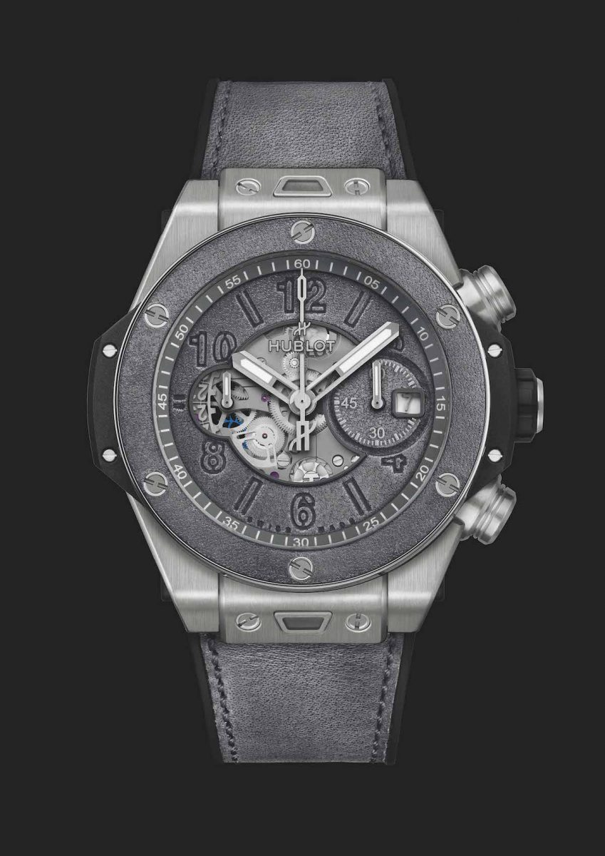 宇舶錶和Berluti更共同研發保存天然皮革光澤原色的技術,使腕錶能長久展現皮革原本色調。Big Bang Unico Berluti 冷灰計時碼錶搭載自製UNICO自動上鍊飛返計時機芯,提供三日全天動力儲存。