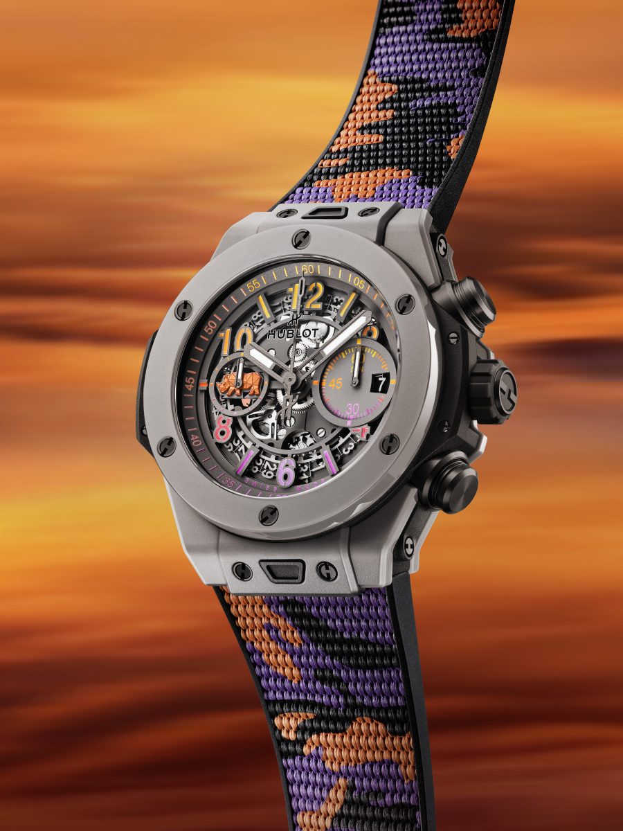 Big Bang Unico SORAI犀牛灰限量錶,錶殼採用特殊微噴砂犀牛灰的陶瓷材質,鏤空錶盤整體呈現非洲大地落日餘暉的天空多樣色彩,包括黃色、橙色、紫色和粉色,代表著黎明帶來的無限希望,位於9點鐘的醒目橘色犀牛造型,提醒我們保育犀牛刻不容緩。搭載Unico自製自動上鏈飛返計時機芯,提供72小時動力儲存。延伸自錶殼與錶盤的繽紛迷彩與灰色兩款複合材質錶帶,風格各有不同,而迷彩錶帶以特製硫化橡膠技術,確保錶帶的色澤圖案可以持久如新,完美繪製出的線條精緻度達1/10毫米,這項技術也是製錶業首創。透過“One Click”單鍵快拆錶帶裝置,可輕易搭配造型更換錶帶。
