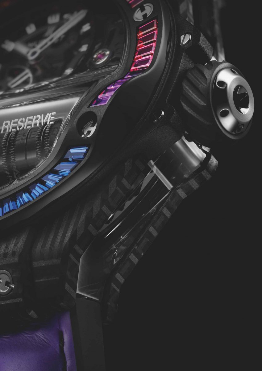 透過採用藍寶石鏡面材質以及弧形設計,使得動力儲存的顯示效果更為清晰矚目。動力傳輸採用製錶界極為少見的垂直90度的螺旋式齒輪傳輸機制,讓發條動力能夠順暢傳輸到顯示小時與分鐘的齒輪系統。此外,擺輪至於錶盤 2 點鐘位置,與 10 點鐘位置可見的螺旋式齒輪營造和諧對稱的美感。錶冠上的蝸輪螺旋狀飾紋與螺旋式齒輪遙相呼應;可手動或透過電動 Torx 觸針完成上鍊。Big Bang MP-11彩虹3D碳纖維腕錶成功續寫了 MP-11 機芯的傳奇故事,並再次開創未來感潮流時計風潮。
