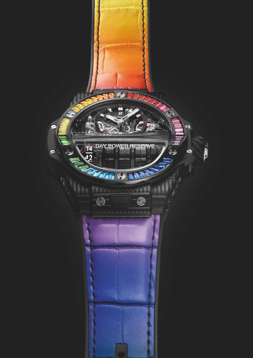 BIG BANG MP-11彩虹3D碳纖維腕錶/錶徑:45mm/機芯:HUB9011自製手動上鏈鏤空機芯/動力儲存:14天/防水深度:30m/建議售價: NTD 3,597,000