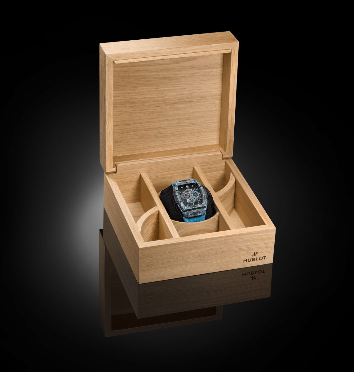 宇舶錶承襲一貫的時尚奢華運動風的鮮明品牌形象,別出心裁的將Spirit of Big Bang迷彩藍碳纖維計時碼錶,配備輕便透氣的功能性藍色科技魔鬼氈錶帶,賦予錶帶柔軟的觸感和立體的紋理,既增添視覺效果,又提升了佩戴舒適度。無論是作為夏季戶外運動或是悠閒渡假出遊搭配,其舒適且時尚的設計,為穿戴者點綴整體造型。腕錶還附有黑色立體橡膠錶帶,佩戴者可通過“One Click”單鍵快拆裝置,輕鬆快捷地更換錶帶。沉穩的霧黑色元素增添穩重感,即使穿著正裝,也能使整體外觀更加協調,將運動風與優雅氣息結合,展現輕鬆自信的風格。