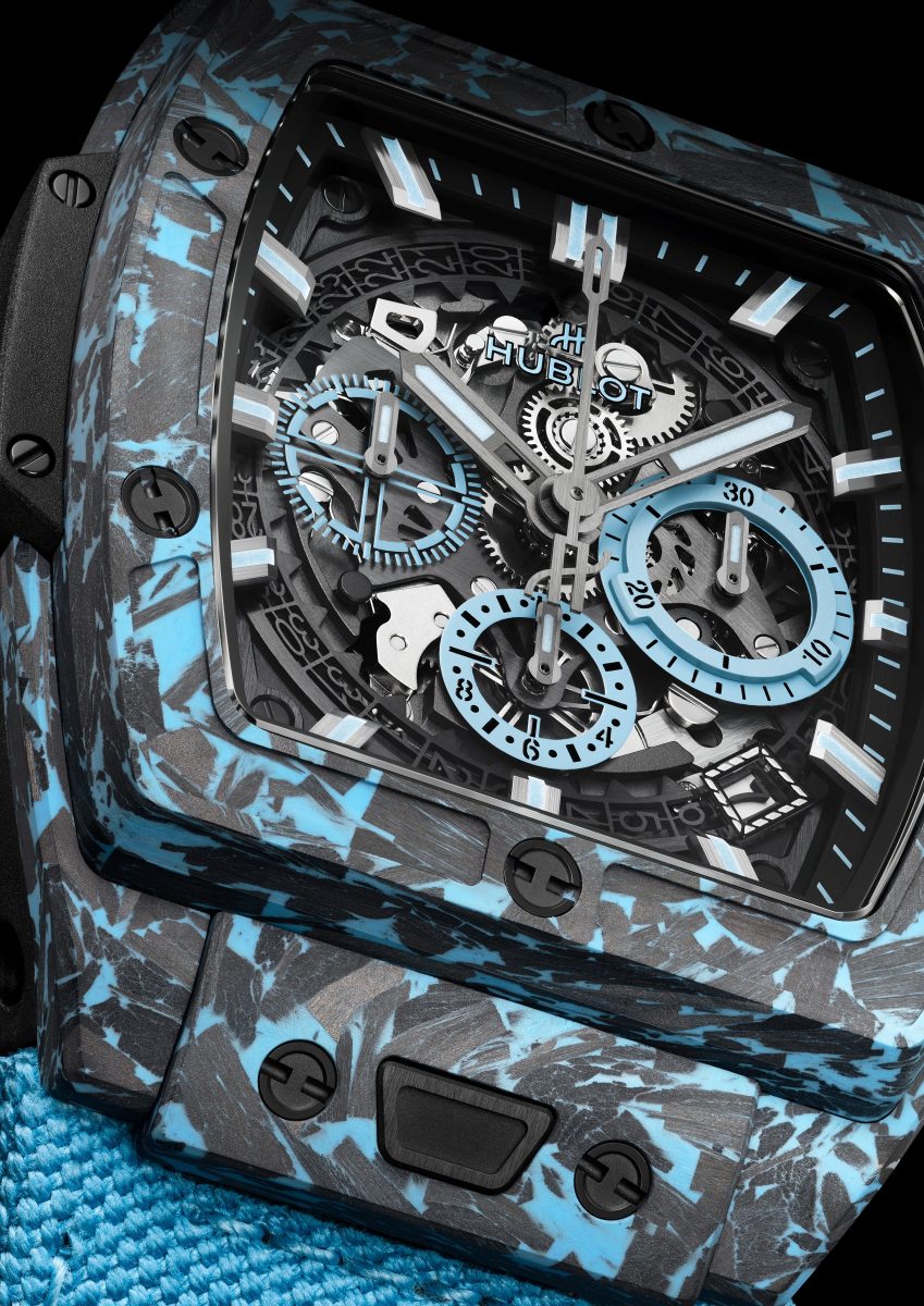 Spirit of Big Bang迷彩藍碳纖維計時碼錶提供50小時長動能。通過藍寶石水晶表殼可以清晰看到其複雜的機械結構,藍色指針和刻度為錶盤增添了強烈的節奏感和結構美感。3點鐘和6點鐘位置各設有30分鐘和12小時計時盤,能分別記錄長達11小時29分59秒的時間,9點鐘位置為小秒盤。這三個計時盤均為藍色,呼應12點鐘位置的藍色品牌標誌。霧黑的日期盤轉動到4點半的白色立體幾何日期窗,以白底清晰呈現日期顯示。鏤空錶盤在迷彩藍碳纖維錶殼的勾勒下,不僅在外觀上看起來更加有層次,同時也多了幾分率性的感覺。