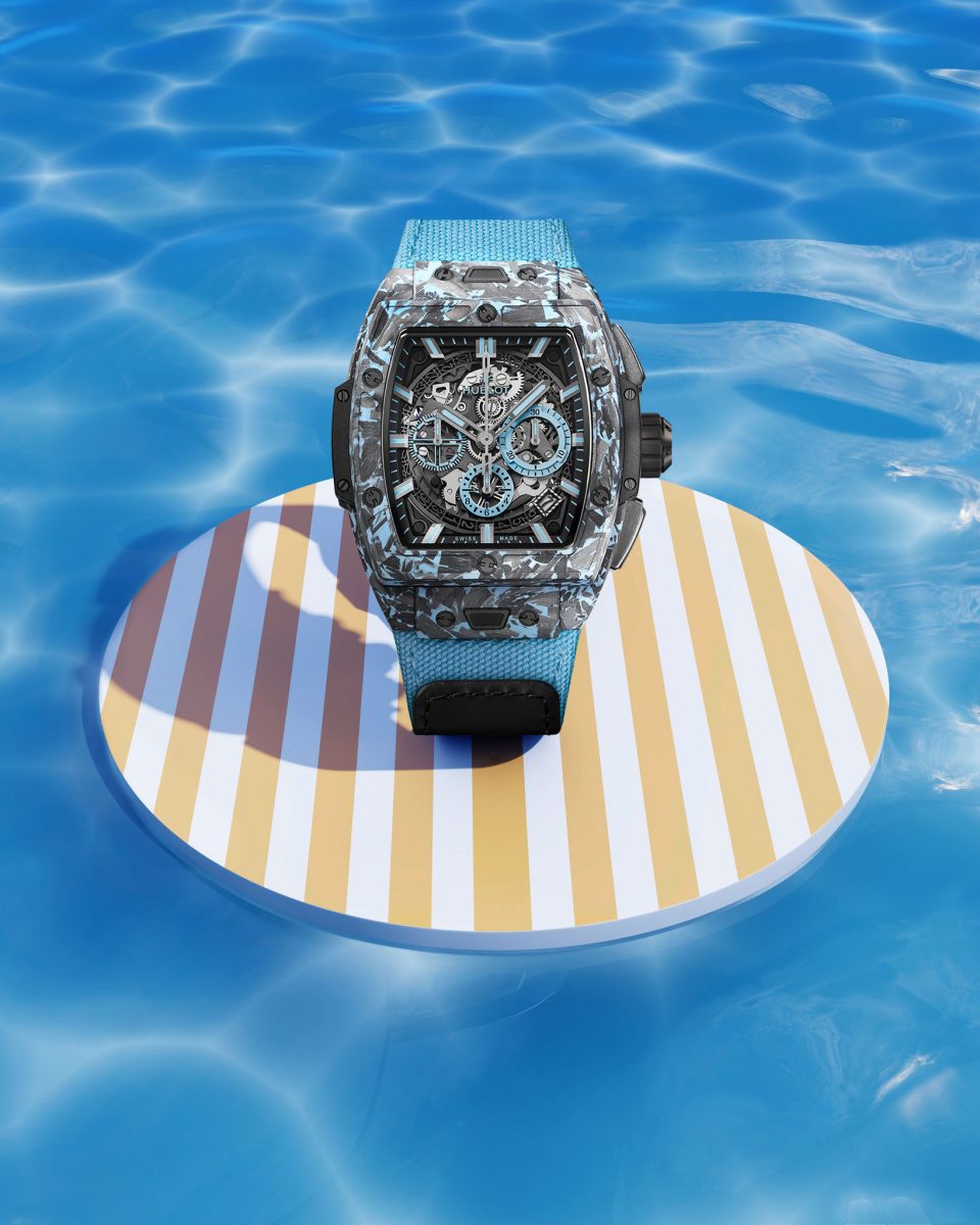 瑞士頂級鐘錶品牌Hublot宇舶錶,以擅長打造腕錶複合材質的運用及變化,推出最能代表盛夏的高顏值都會運動風腕錶: Spirit of Big Bang 迷彩藍碳纖維計時碼錶。將科技感的迷彩藍碳纖維配上運動風的機能性藍色魔鬼氈錶帶,以看似衝突卻演變成更有層次的混搭潮流,承襲品牌原有的DNA,將鏤空面盤搭配錶殼也換上藍色元素,不僅增添開闊的視覺效果,更彰顯了腕錶本身的動感個性。近日晉身為人父的籃球好手張宗憲,佩戴這款腕錶,更顯年輕潮爸的時尚感和霸氣。全球限量28只。
