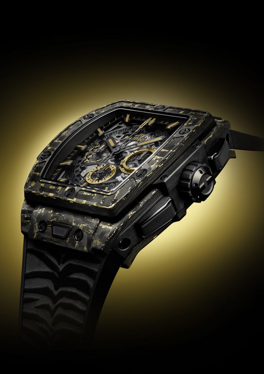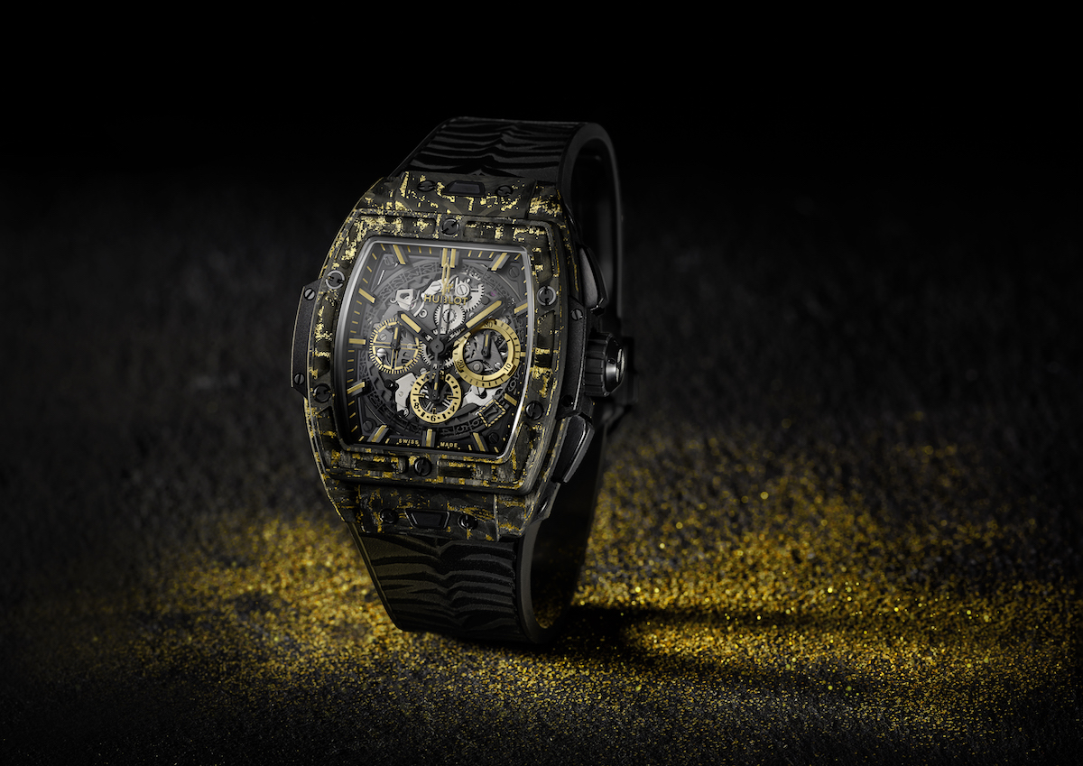 Spirit of Big Bang 碳金虎腕錶全球限量200只,由宇舶研發製成的結晶碳纖維(frosted carbon fiber)融合黃金所研發的獨家材質,每款腕錶所顯現的金色紋理均不同,而沉潛在黑色結晶碳纖維,所散發的神祕金色光芒,有如藏身在黑夜叢林的猛虎斑紋。透過噴砂和緞面處理的黃金點綴在指針,時標和小錶盤上,襯托鏤空面盤更加耀眼有立體感!