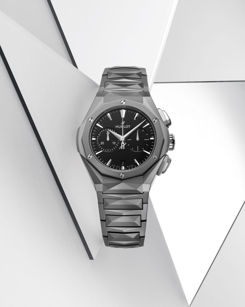 來自宇舶錶與法國雕塑藝術家Richard Orlinski 的2023全新聯名腕錶。41毫米錶殼搭載HUB1153自動上鏈計時機芯。運用Orlinski作品標誌性的多角度切面與棱角分明的結構造型,打造立體感十足的鈦金屬鍊帶,錶鍊共由83個部件組成,特殊倒角形狀的鍊節透過精密設計,經微珠噴砂潤飾的鈦金屬材質賦予腕錶的霧面低調溫潤效果,同時傳遞優雅氣息。錶圈為12邊多角造型。霧黑面盤映襯金屬色澤的立體三角柱時標與指針,即使細節處也呈現藝術家極簡俐落地標誌性符碼。特殊立體切面從錶殼、面盤能完美延伸至錶鍊,不僅為宇舶詮釋「融合的藝術」全新之作,更將現代藝術風注入高階運動腕錶設計中,打造濃厚藝術風格的優雅運動計時腕錶。