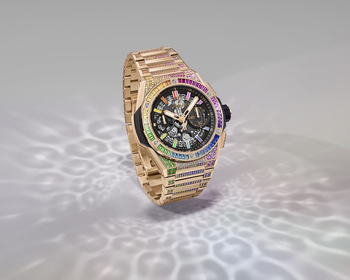 直徑42毫米的錶殼以宇舶獨家皇金材質打造,鑲嵌120顆圓形寶石,錶圈鑲嵌54顆長方形切割寶石,錶鍊則鑲嵌768顆寶石。透過縝密鑲嵌工法,將不同尺寸和形狀的8種礦石: 紅寶石、紫水晶、藍色托帕石、沙弗萊石以及粉色、橙色、藍色和黃色藍寶石完美銜接,以漸層色系巧妙排列,呈現亮眼驚豔的豐富彩虹色調。宇舶訴求的一體式錶殼與錶鍊設計,將錶殼的特殊立體線條完美延伸至錶鍊,錶鍊由三節鍊條構成,錶鍊經過細膩抛光與緞面處理,鍊節採用稜角與倒角建構,透過細膩做工得以流暢銜接每個細節,在風格、材質及色彩達成精準銜接,成就搶眼的視覺效果及完美的佩戴舒適性。