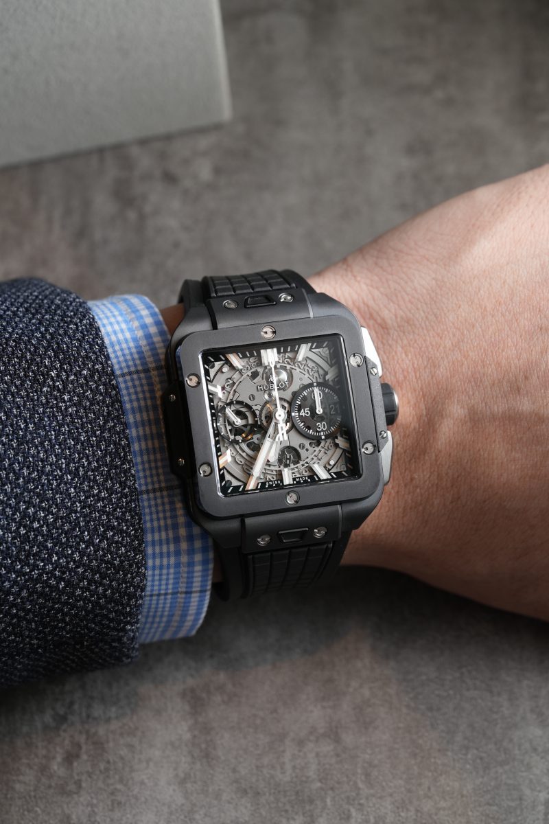 宇舶錶於2022年推出的Square Bang Unico計時腕錶系列,延續其獨特幾何形狀錶殼,2023推出Square Bang Unico魔力黑陶瓷計時碼錶,以獨家高科技陶瓷打造高質感和個性化的風格外型,搭載自製HUB1280 UNICO機芯,這款著名的自動上鍊飛返計時機芯配備導柱輪,振頻為4赫茲(每小時28,800次),並提供72小時的動力儲存,其運轉的機械之美可通過鏤空錶盤、錶背以及藍寶石錶殼一覽無遺。提供卓越的時間精準度和穩定性。以精湛的製錶技藝與創造力,彰顯品牌的卓越工藝。