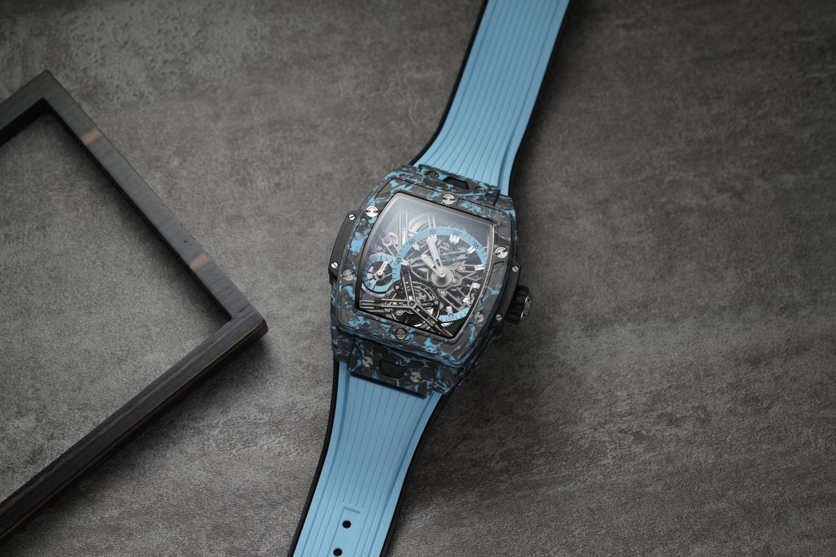 SPIRIT OF BIG BANG 天空藍碳纖維陀飛輪腕錶/錶徑:42mm/機芯:MHUB6020手動上鍊陀飛輪鏤空機芯/動力儲存:115小時/防水深度:30m/建議售價: NTD 3,107,000