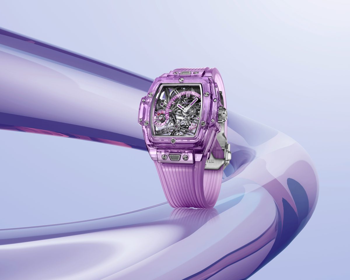 SPIRIT OF BIG BANG 紫色藍寶石陀飛輪腕錶/錶徑:42mm/機芯:MHUB6020手動上鍊陀飛輪鏤空機芯/動力儲存:115小時/防水深度:30m/建議售價: NTD 6,377,000