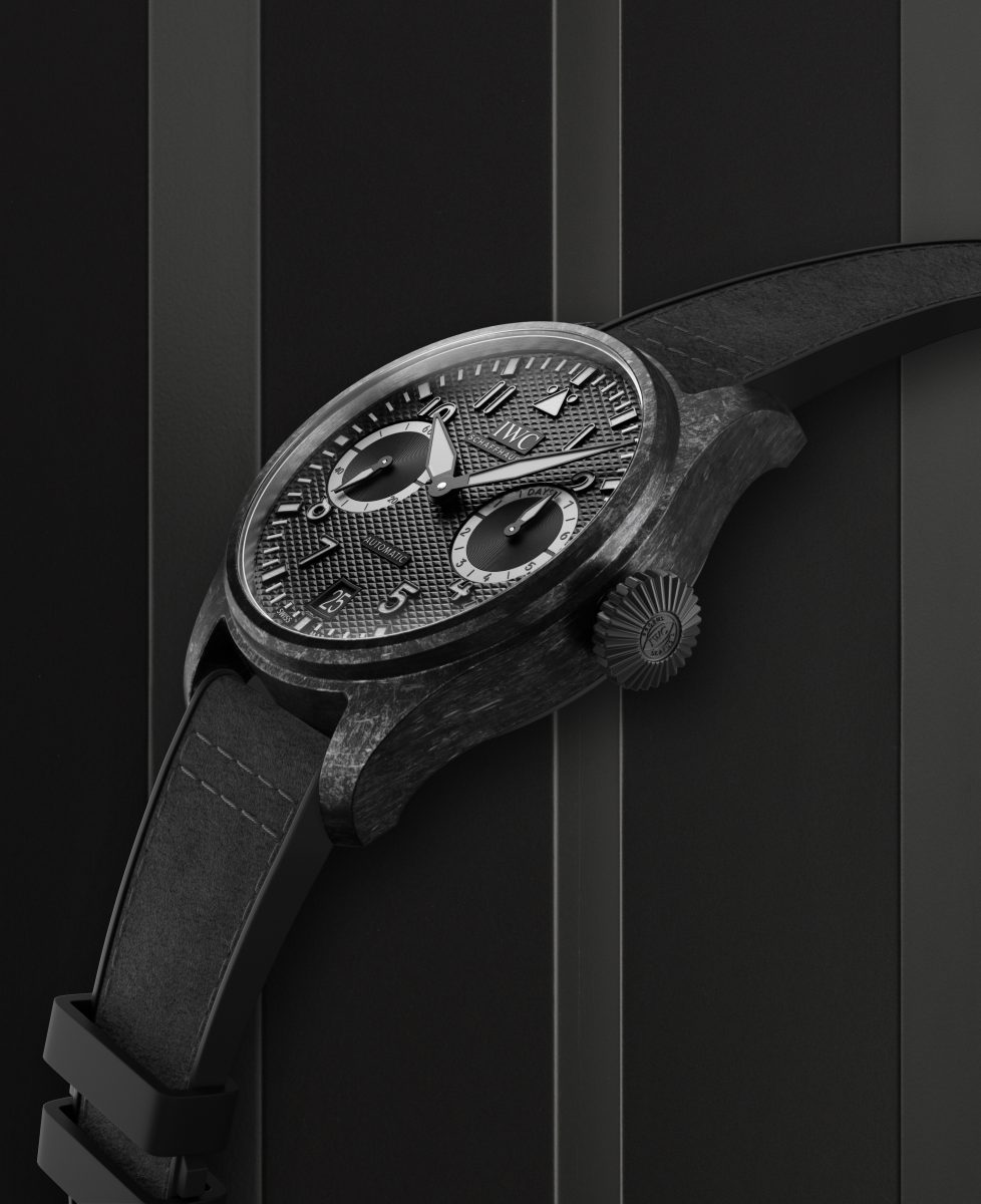 IWC萬國錶首次採用陶瓷複合基材料(ceramic matrix composites)製造錶殼,首先是從傳統的碳纖維強化聚合物開始。在連續數天的「熱解」處理過程中,聚合物基質會轉化為碳,留下緻密的纖維編織物嵌入多孔碳基質中。隨後,在零件上放置矽晶體,一起放入烤箱中加熱。在這個稱為「矽化」的過程中,矽被吸入空隙中,與碳發生化學反應,形成由矽碳化物陶瓷製成的新基質。使用金剛石工具進行打磨後,CMC錶殼會呈現出啞黑色,並具有由纖維決定的獨特結構,使每一件都獨一無二。