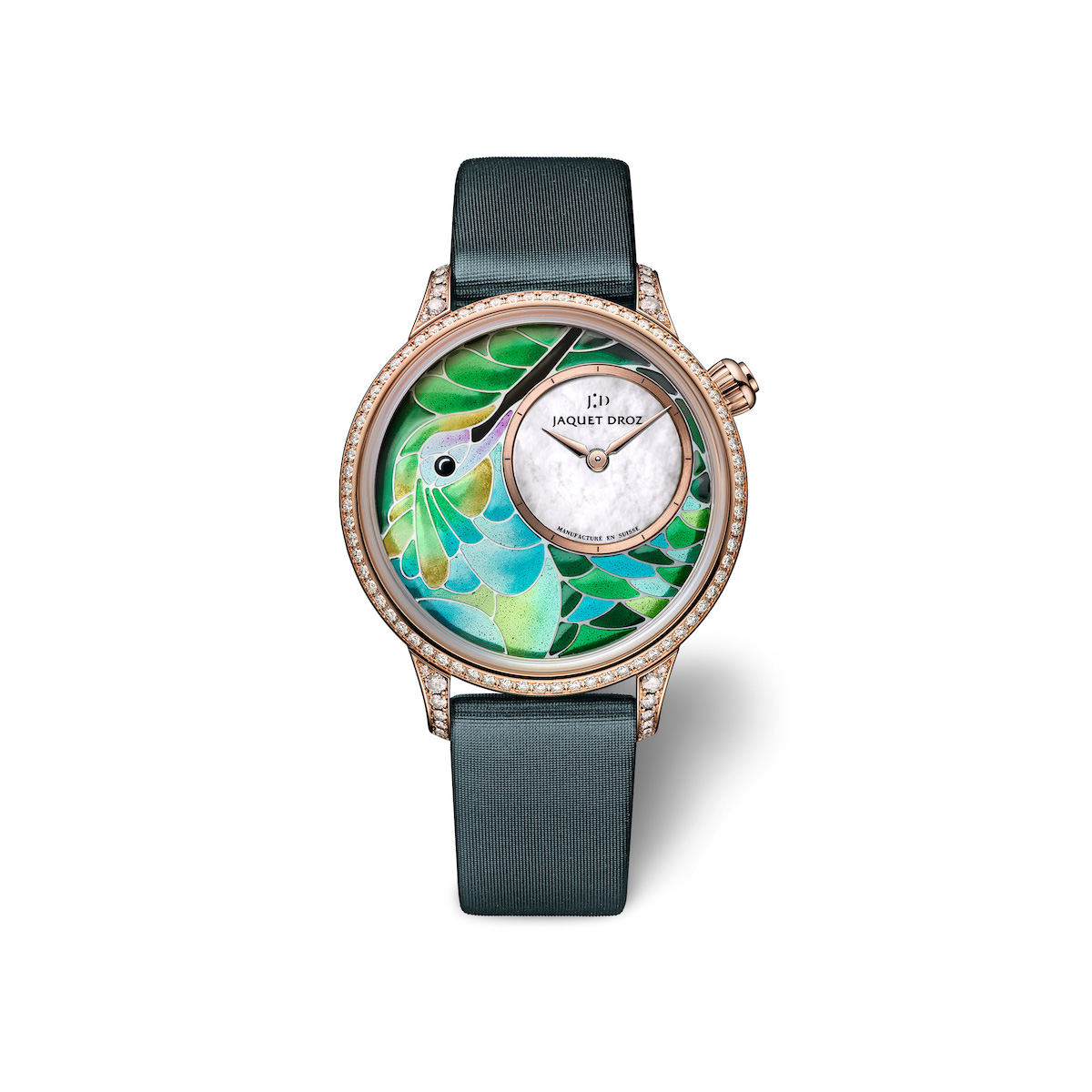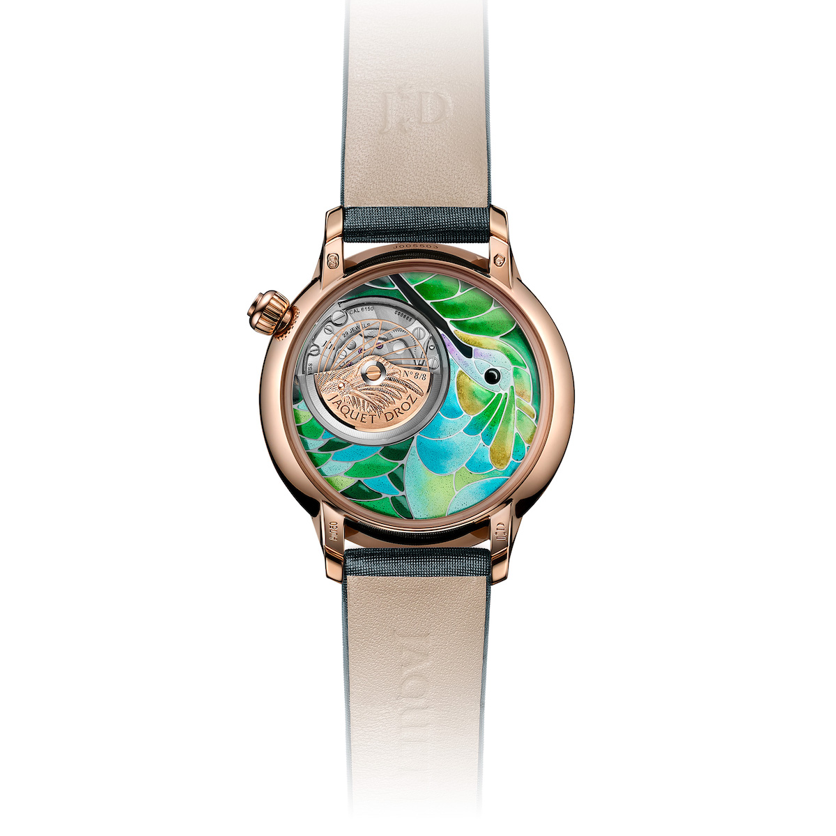 該腕錶的主角是一隻蜂鳥,以微妙的漸層綠色系呈現。雅克德羅(Jaquet Droz)創造了至少七種不同色調,以表達蜂鳥在品牌眼中的夏日歡快觀感。這款時分小針盤腕錶的偏心錶盤選擇設於2時位置,為蜂鳥營造寬闊錶面,表達其豐富色調,展現鏤空琺瑯(拉丁文即smalta clara)技藝。