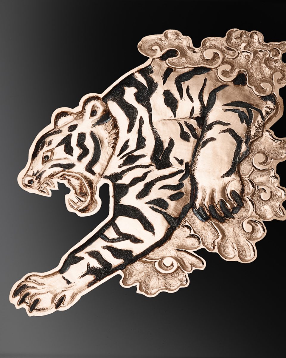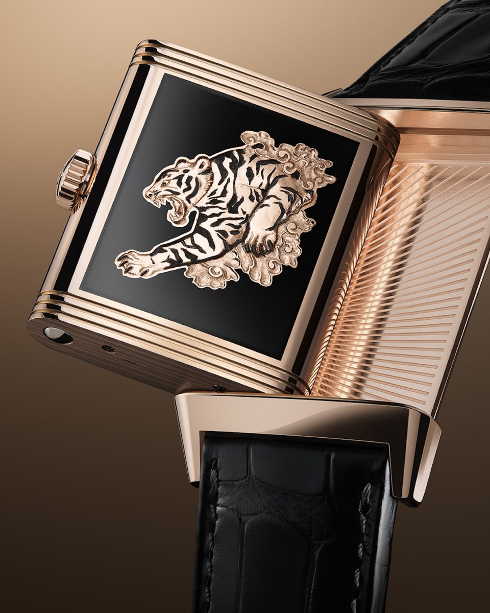 翻轉錶殼,即可看到一隻威風凜凜的猛虎躍然眼前。猛虎圖案鐫刻於玫瑰金錶背上,栩栩如生,好像將要從不透明的黑色大明火琺瑯背景中掙脫而出。老虎的皮毛經過拋光潤飾,並設有磨砂處理的鍍銠條紋,可捕捉並折射光線,獨特的光影效果令猛虎更加靈動威武。