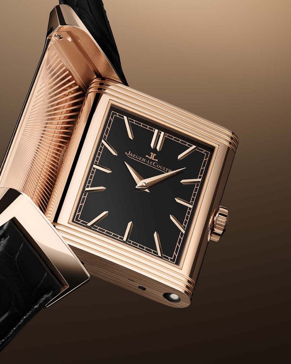 與錶背一樣,這款Reverso Tribute Enamel翻轉系列琺瑯腕錶的錶盤亦覆以不透明的黑色大明火琺瑯。 錶盤設計簡約優雅,搭配刻面鑲貼時標、軌道式分鐘刻度及太子妃式指針,與玫瑰金錶殼完美配襯,突顯亮黑色背景的精緻美感。