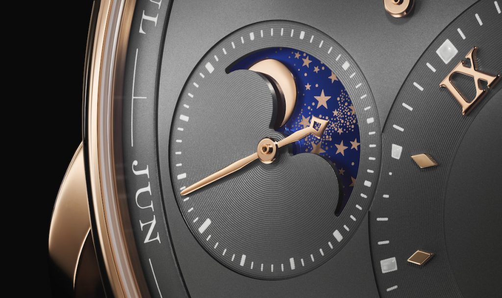 萬年曆是Lange 1 Perpetual Calendar的主要複雜功能,但並非唯一的複雜功能。這款腕錶還配備附日/夜顯示的月相顯示功能。月相顯示與日/夜顯示的組合共有兩層,其設有漸變藍色的實心18K金天體圓盤。圓盤每24小時圍繞其軸心自轉一圈。在此基礎上,以18K白金或18K玫瑰金打造的月亮準確模擬月球 29天12小時44分3秒的朔望軌道,因此每隔122.6年才需校正一天。