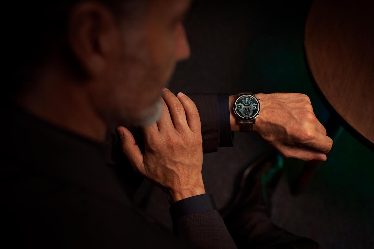如此嶄新的技術理念與創新設計相輔相成。橫跨整個錶盤的弧形時間橋是矚目的一大設計元素,也是機芯的一部分,為所有時間顯示增添優雅風範。ZEITWERK HONEYGOLD “Lumen”採用黑色鍍銠德國銀製作,與深色的藍寶石水晶玻璃錶盤相得益彰。