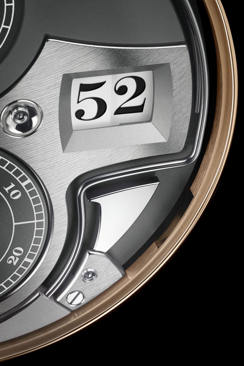 這款極為精巧複雜的腕錶能夠按照指示鳴響報時。與每小時和每十五分鐘鳴響的傳統裝置不同,其三問裝置每十分鐘進行報時。這種特殊的報時機制與腕錶的機械數字顯示巧妙吻合。只需按下 10 時位置的按鈕,每走過一小時,腕錶便會發出低音鳴響,而雙音(高音/低音)和高音則分別代表每十分鐘和每分鐘。例如,7 時 52 分的報時聲響由七聲低音、五聲雙音和兩聲高音組成。所聞即所見。所見即所聞。