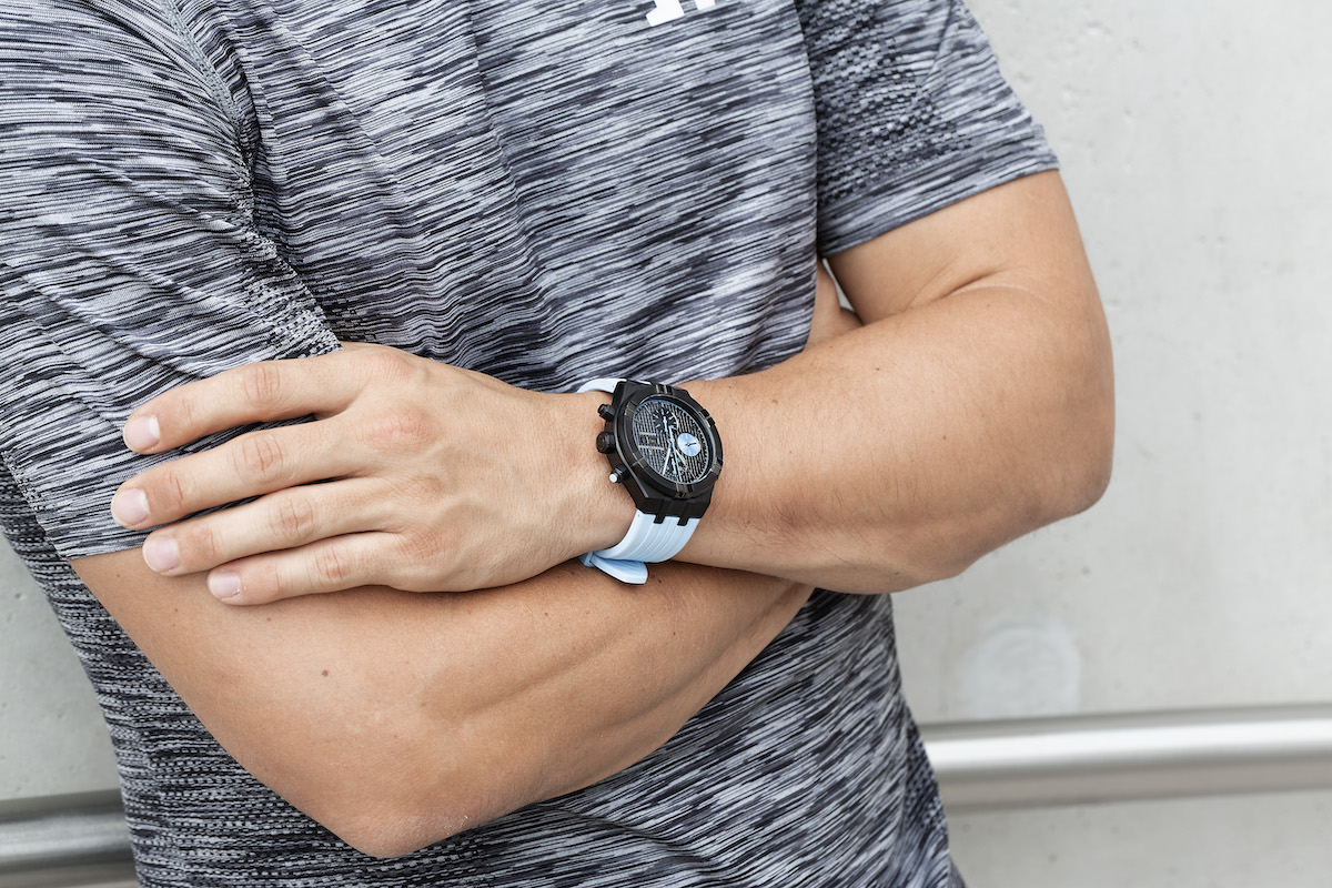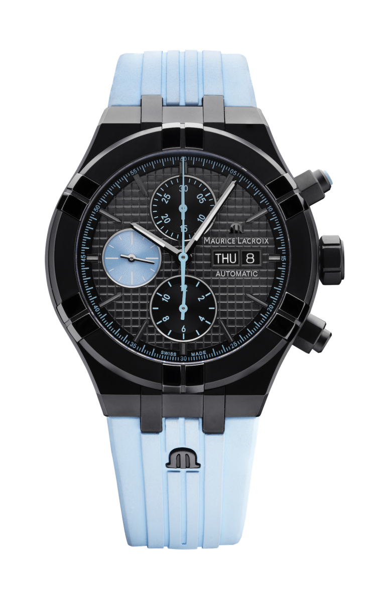 AIKON Sprint自動計時碼錶秉承AIKON備受歡迎的人體工學設計,佩戴時格外舒適。腕錶隨附首次用於AIKON系列的淺藍色FKM橡膠錶帶。該等級數的橡膠的彈性比一般橡膠更佳,佩戴更加舒適。此外,FKM橡膠亦具更佳的耐磨性,不易褪色。錶帶亦飾有品牌的「M」標誌,並搭配噴砂黑色DLC塗層針式錶扣。