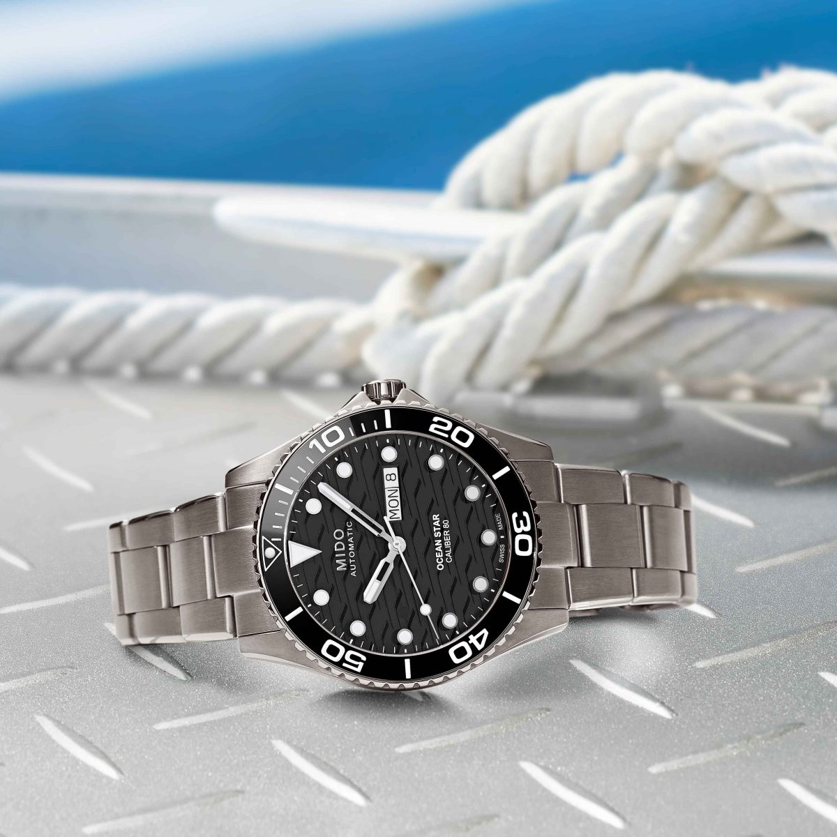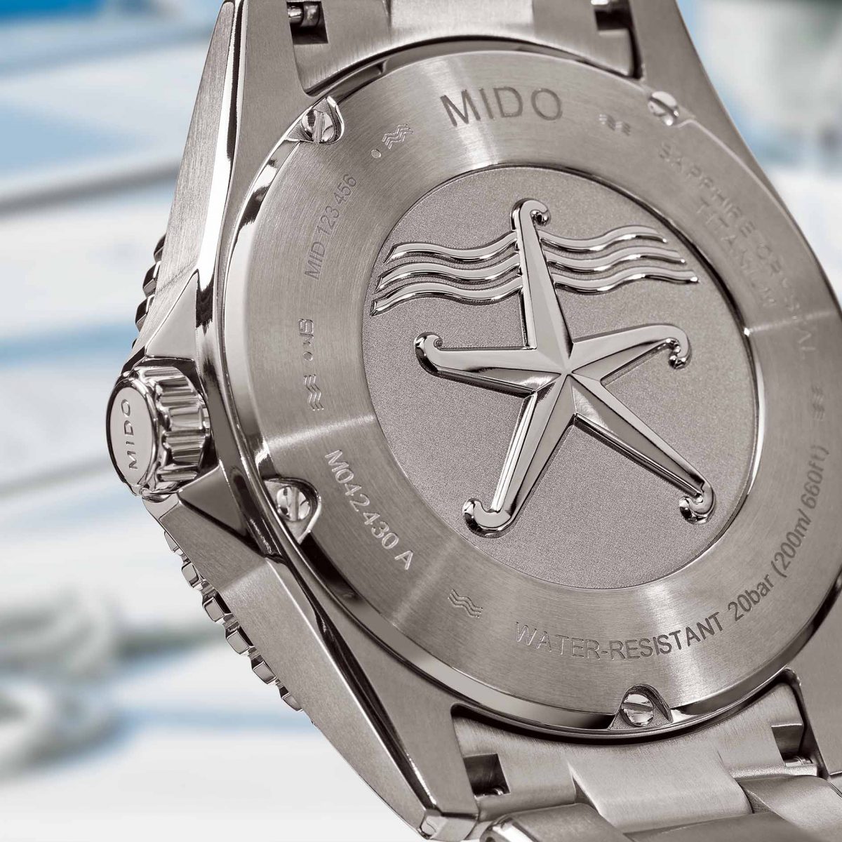 全新海洋之星200米陶瓷圈鈦金屬腕錶錶殼與錶帶皆採用鈦合金材質打造,質地輕盈、堅固,配戴起來毫無束縛感,同時防水深度達200米,全新腕錶將一切戶外探險所需匯集於一身,化身最強隊友,陪伴海洋探險家們乘風破浪,迎接刺激挑戰。腕錶搭載MIDO Caliber 80自動上鍊機芯,提供可達80小時動力儲存。時標刻度與時、分、秒針均採用Super-LumiNova®白色夜光塗層處理,無論是在水下或是夜間都可確保精準讀時。