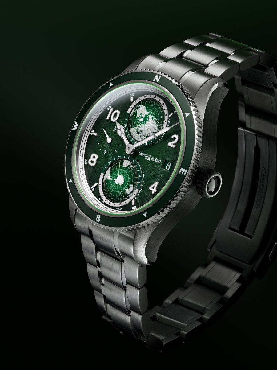 新色首度亮相的Geosphere世界時間零氧腕錶,搭載MB 29.25自動上鍊機芯,配備自製世界時區複雜功能和42小時動力儲存,並搭配旋轉的南半球與北半球地球儀、24小時刻度、晝夜指示、雙時區顯示,以及日期顯示功能。採用42公釐精鋼錶殼,搭配凹槽紋雙向旋轉綠色陽極氧化鋁錶圈,飾有夜光羅盤方位,並配備綠色暈染冰川圖案錶盤。腕錶可替換的精鋼錶鍊,採用梯形設計並附有微調系統。