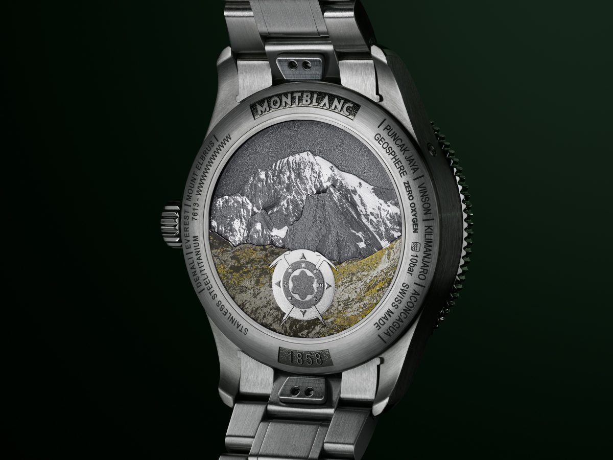 錶殼底蓋運用了複雜的處理技術,以雷射產生氧化作用,製作彩色的白朗峰山脈圖像。這種特殊的鐫刻技術以金屬製作立體浮雕,透過霧面和拋光處理營造鮮明的對比效果,呈現的圖像非常精細,有如照片一樣;這項技術已成為MONTBLANC的主要特色,確保鐫刻圖像可以永久存留且不會褪色。白朗峰山脈景緻襯托著品牌標誌,標誌外圍飾有羅盤方位和兩把交叉的冰斧,展現此系列的登山精神,可見於1858系列所有腕錶錶背。